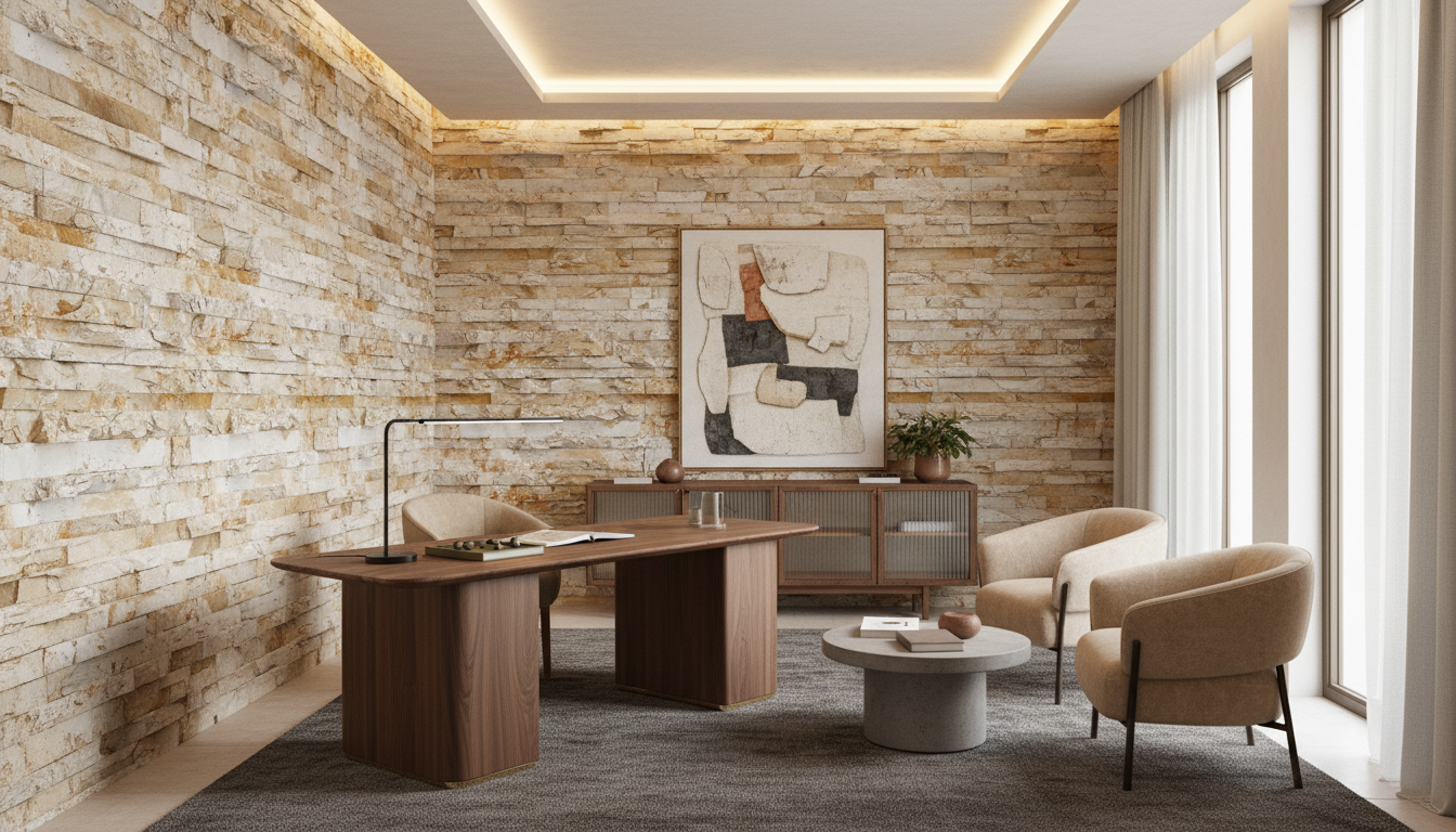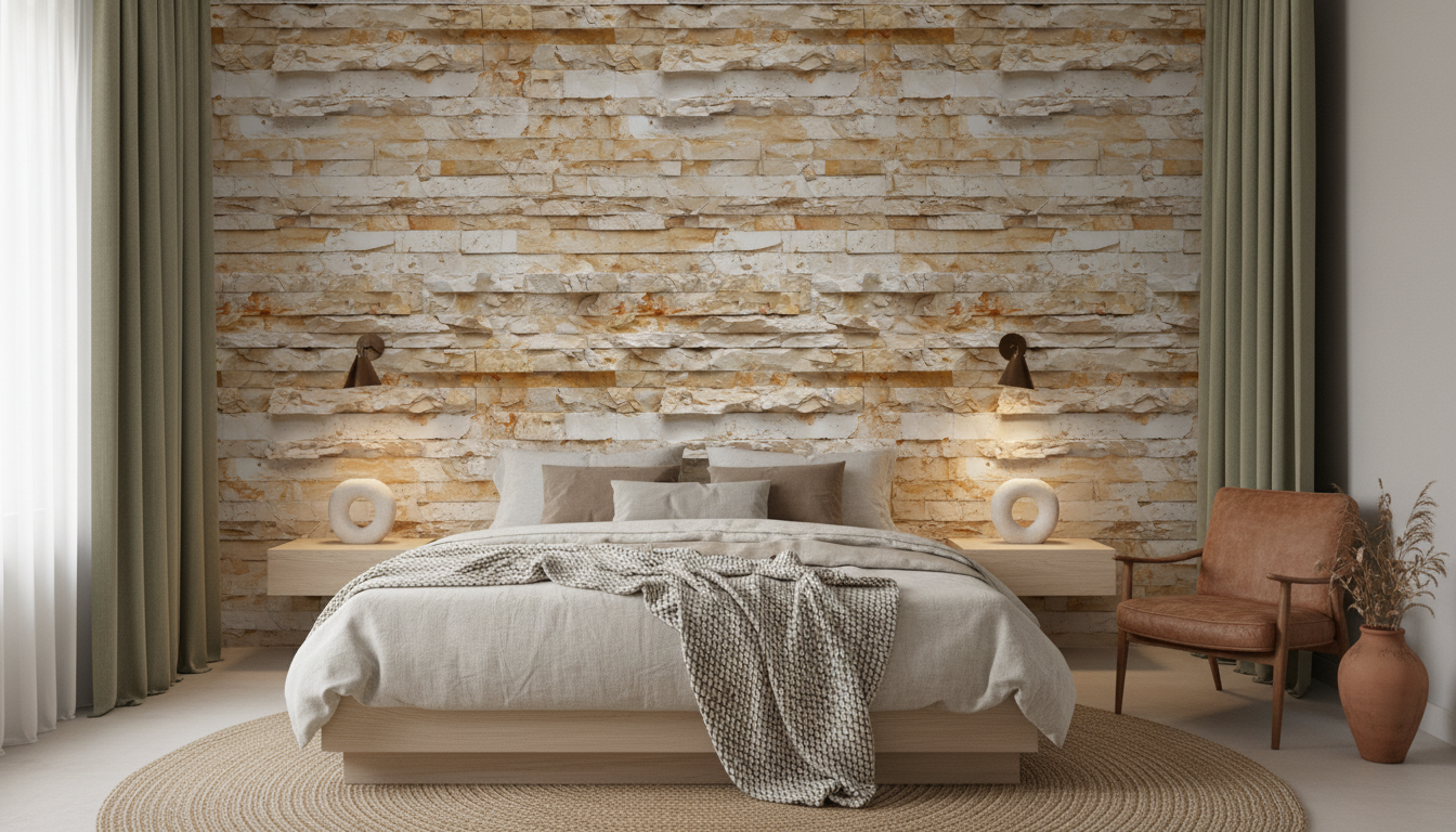 Ce revêtement mural imitation pierre trouve sa place idéale dans un salon contemporain où il formera un mur d’accent saisissant, particulièrement derrière un canapé en lin naturel ou un mobilier en bois flotté. Dans une chambre parentale, il créera une tête de lit spectaculaire, s’harmonisant parfaitement avec des textiles en chanvre écru et des luminaires en laiton brossé. Pour un bureau ou un coin lecture, cette texture pierre apportera la concentration et la sérénité nécessaires au travail intellectuel.