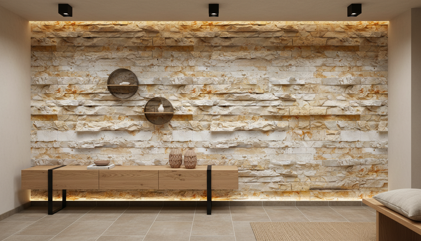 Cette création d’exception reproduit méticuleusement l’aspect des pierres empilées aux nuances subtiles, où se mêlent harmonieusement le beige nacré, l’ocre doré et le blanc cassé. Chaque plaquette de pierre révèle sa texture unique : surfaces lisses poncées par le temps, arêtes irrégulières ciselées par la nature, et ces magnifiques veines dorées qui serpentent comme des fils d’or à travers la matière. L’effet de relief tridimensionnel confère une profondeur remarquable, créant un jeu d’ombres et de lumières qui anime délicatement vos murs tout au long de la journée.