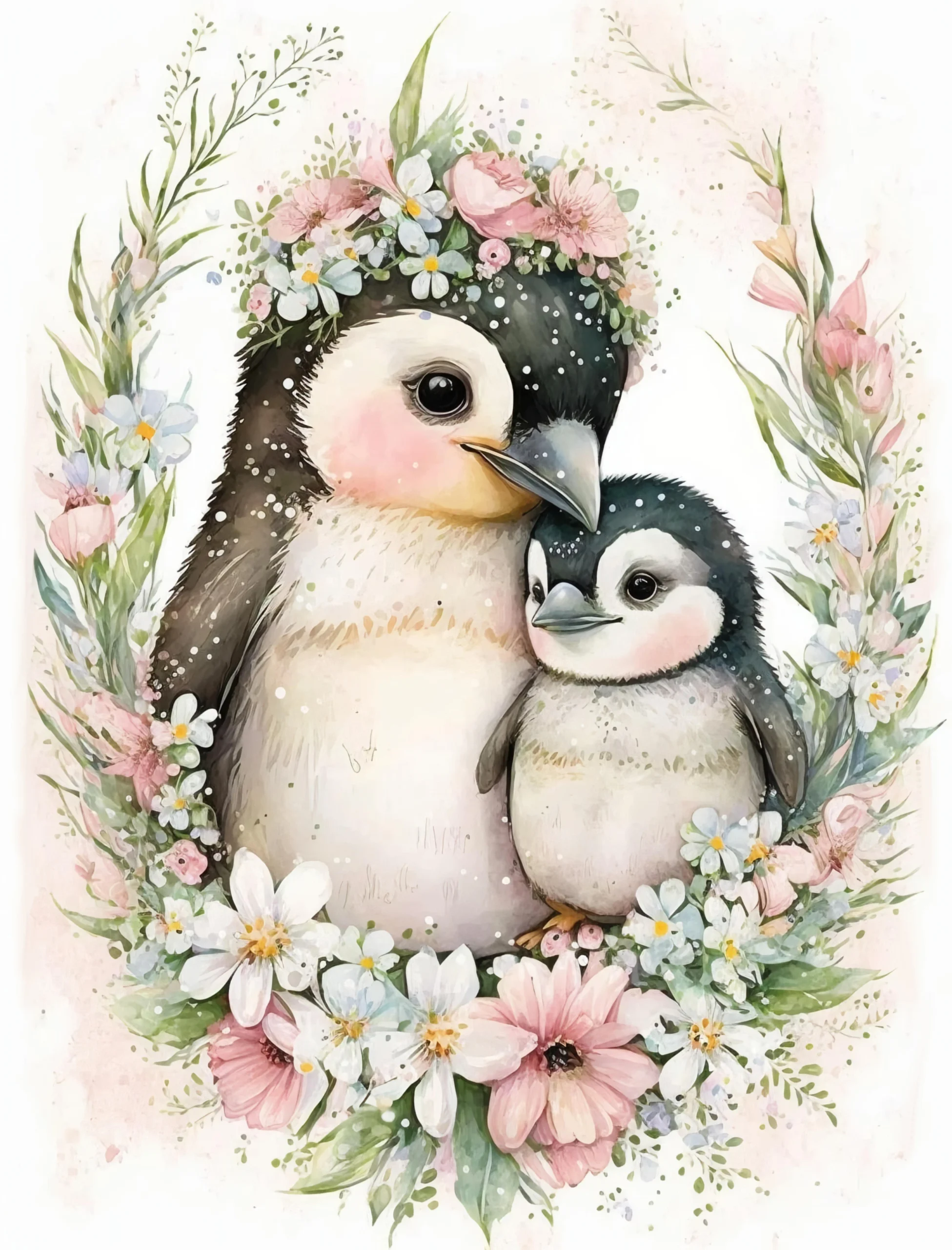 Laissez-vous emporter par la tendresse infinie de cette aquarelle délicate où deux pingouins complices se blottissent au cœur d’une couronne florale aux tons poudrés, comme suspendue dans un rêve hivernal parsemé de flocons cristallins.