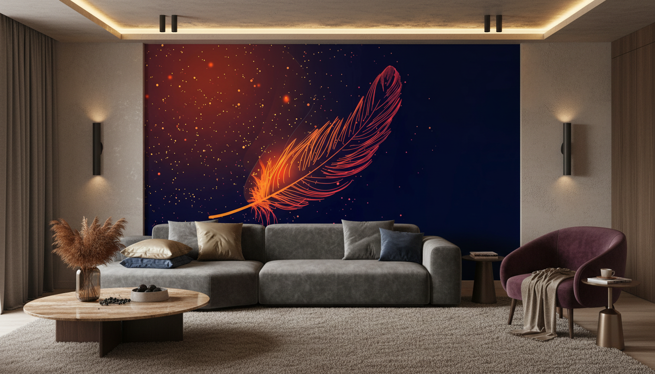 Ce papier peint salon moderne trouve sa place idéale dans un bureau créatif, une chambre parentale ou un espace détente. Pour sublimer cette décoration murale contemporaine, associez-la à du mobilier aux lignes épurées en bois sombre ou métal brossé. Les textiles naturels comme le lin blanc cassé ou la laine bouclée crème créeront un équilibre parfait avec l’intensité chromatique de la plume. Intégrez des éclairages indirects et quelques objets déco cuivrés pour faire écho aux tons chauds de cette œuvre murale exceptionnelle.