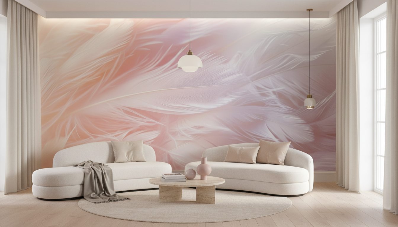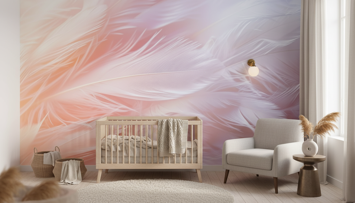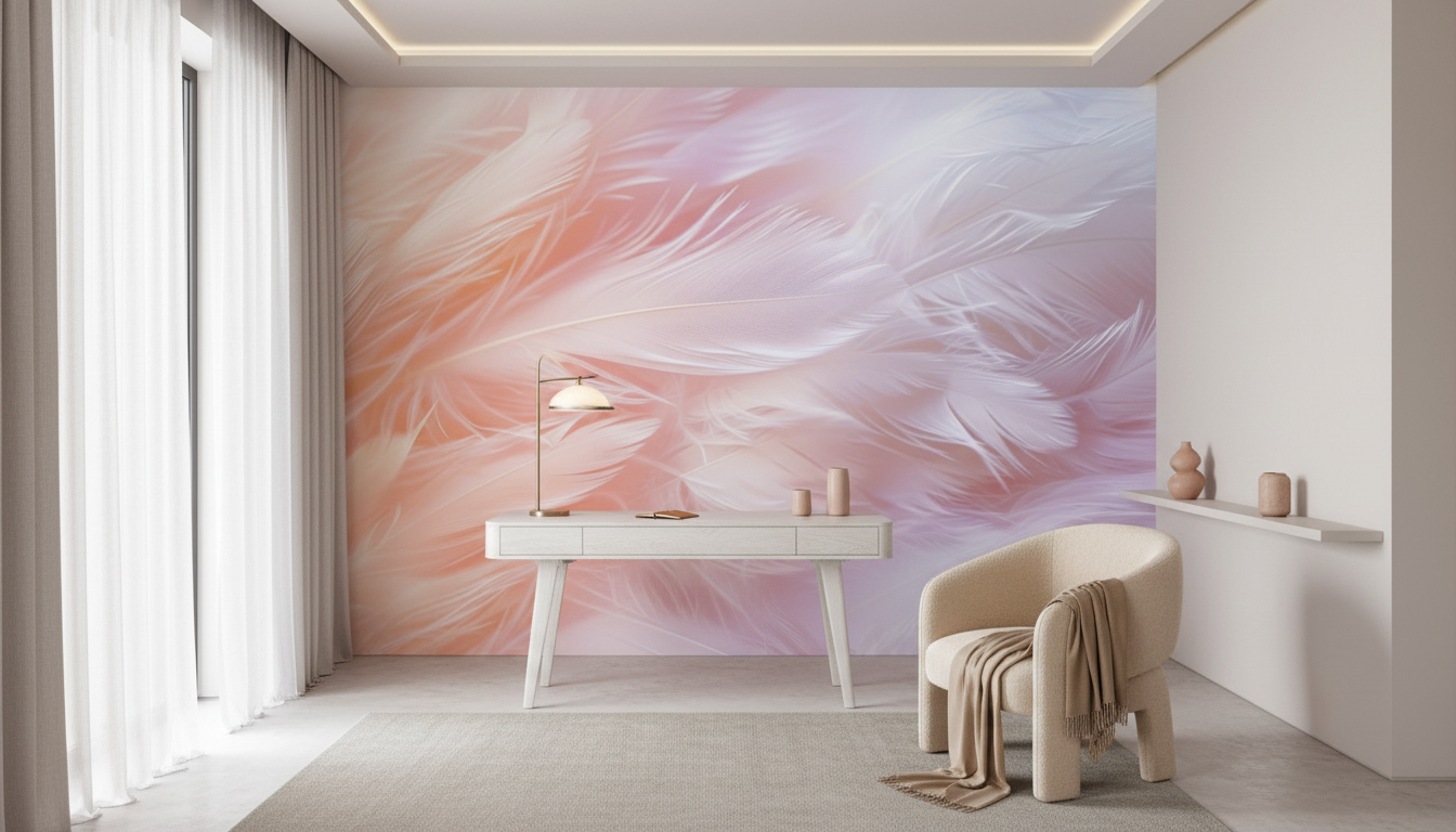 Ce papier peint plumes révèle un univers de délicatesse infinie, où des plumes duveteuses semblent flotter dans un ballet aérien suspendu. Le motif plumeux déploie ses structures fines et soyeuses dans un dégradé pastel sublimement orchestré. Les tons poudrés évoluent harmonieusement du blanc nacré vers des nuances de rose tendre, pêche délicat et mauve lavande, créant une symphonie chromatique d’une rare élégance. Chaque plume stylisée révèle sa texture naturelle avec un réalisme saisissant, les barbules finement dessinées captant la lumière pour créer des jeux d’ombres et de reflets d’une poésie absolue.