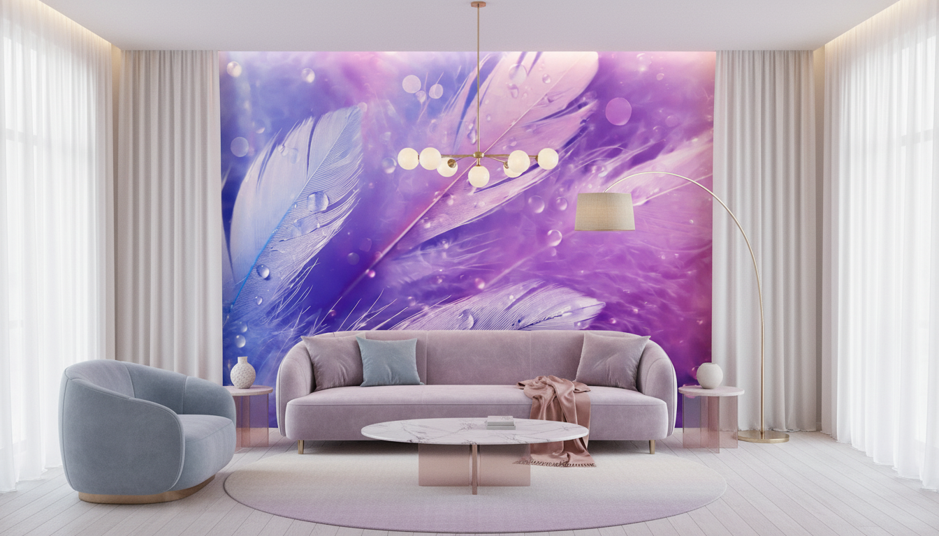 Ce papier peint artistique dévoile une composition féerique de plumes délicates aux textures finement détaillées, flottant gracieusement dans un univers onirique. Le style graphique hyperréaliste révèle chaque barbe et chaque rachis avec une précision saisissante, créant un effet de profondeur remarquable. Les nuances violettes, roses et bleues se fondent harmonieusement dans un dégradé céleste, évoquant les premiers rayons de l’aube ou les dernières lueurs du crépuscule. Des gouttes de rosée cristallines parsèment délicatement cette scène poétique, ajoutant une dimension magique et contemplative à l’ensemble.