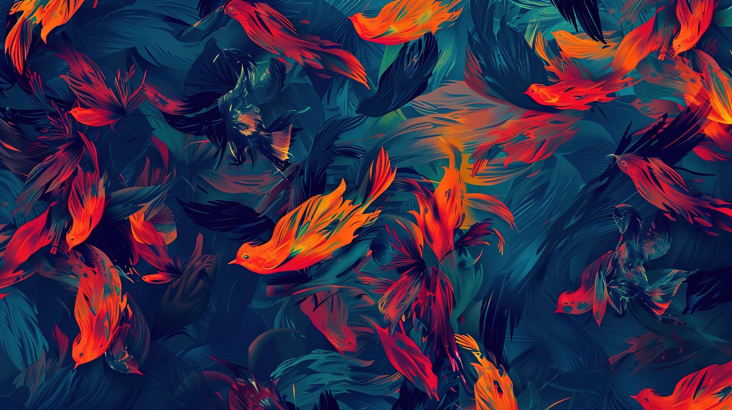 Ce papier peint poissons tropicaux dévoile un univers aquatique fascinant où des créatures marines aux teintes orange flamboyantes et rouge corail évoluent gracieusement sur un fond aux nuances bleu-vert profondes. L’illustration, réalisée dans un style artistique contemporain aux allures de peinture numérique, capture le mouvement fluide des poissons exotiques avec leurs nageoires déployées tel un ballet aquatique perpétuel. Les tons turquoise et bleu océan se mêlent harmonieusement aux éclats orange vif et rouge vermillon, créant un contraste saisissant qui évoque la richesse chromatique des récifs coralliens tropicaux.