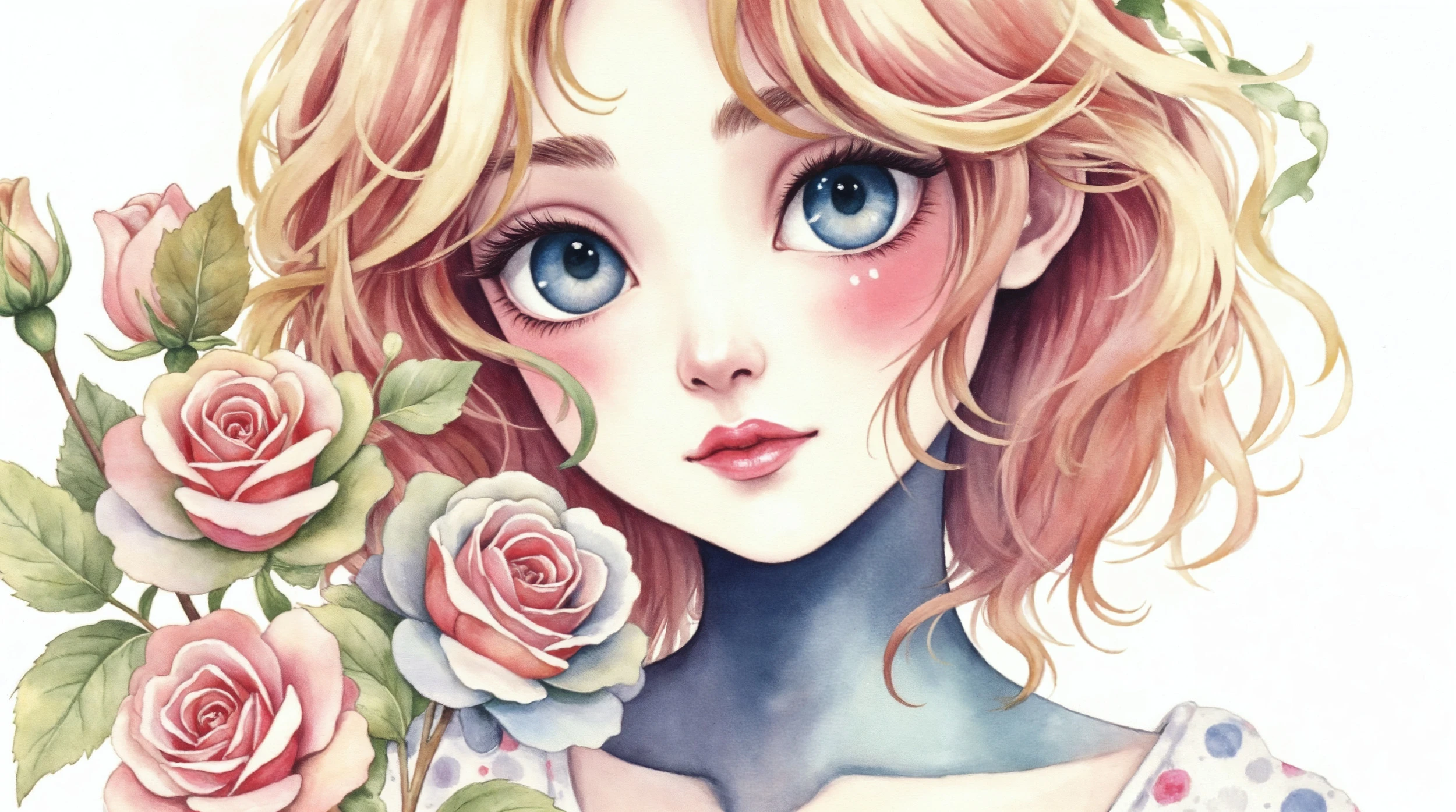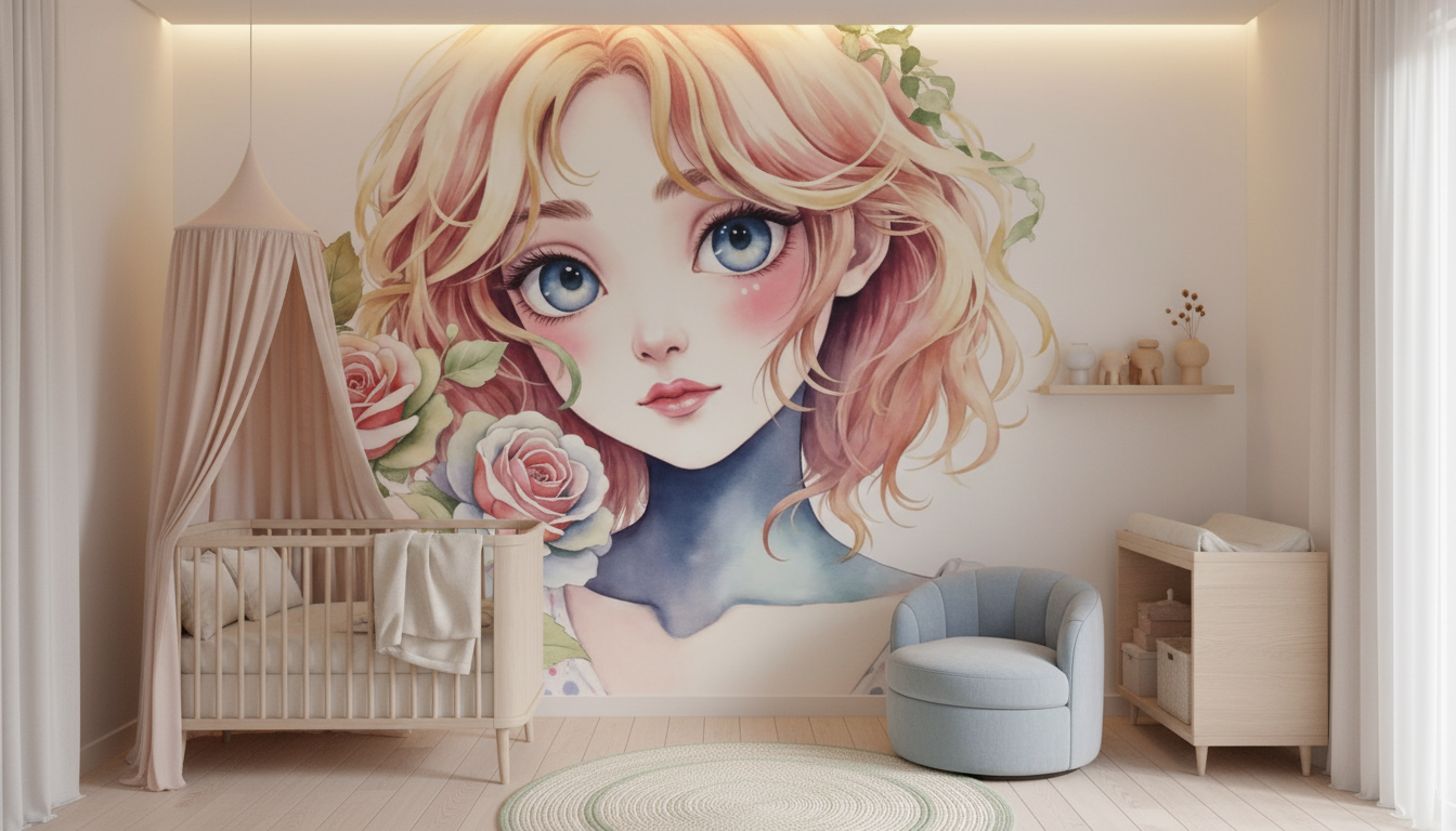 Ce papier peint portrait artistique dévoile le visage délicat d’une jeune fille aux cheveux blonds ondulés, sublimé par des roses pastel qui semblent danser autour d’elle comme un bouquet de douceur. L’illustration, réalisée dans un style aquarelle romantique, capture toute la poésie d’un portrait moderne aux accents vintage. Les yeux bleus cristallins de l’enfant reflètent une profondeur émotionnelle saisissante, tandis que sa peau nacrée contraste harmonieusement avec les tons rosés de ses joues délicatement fardées.