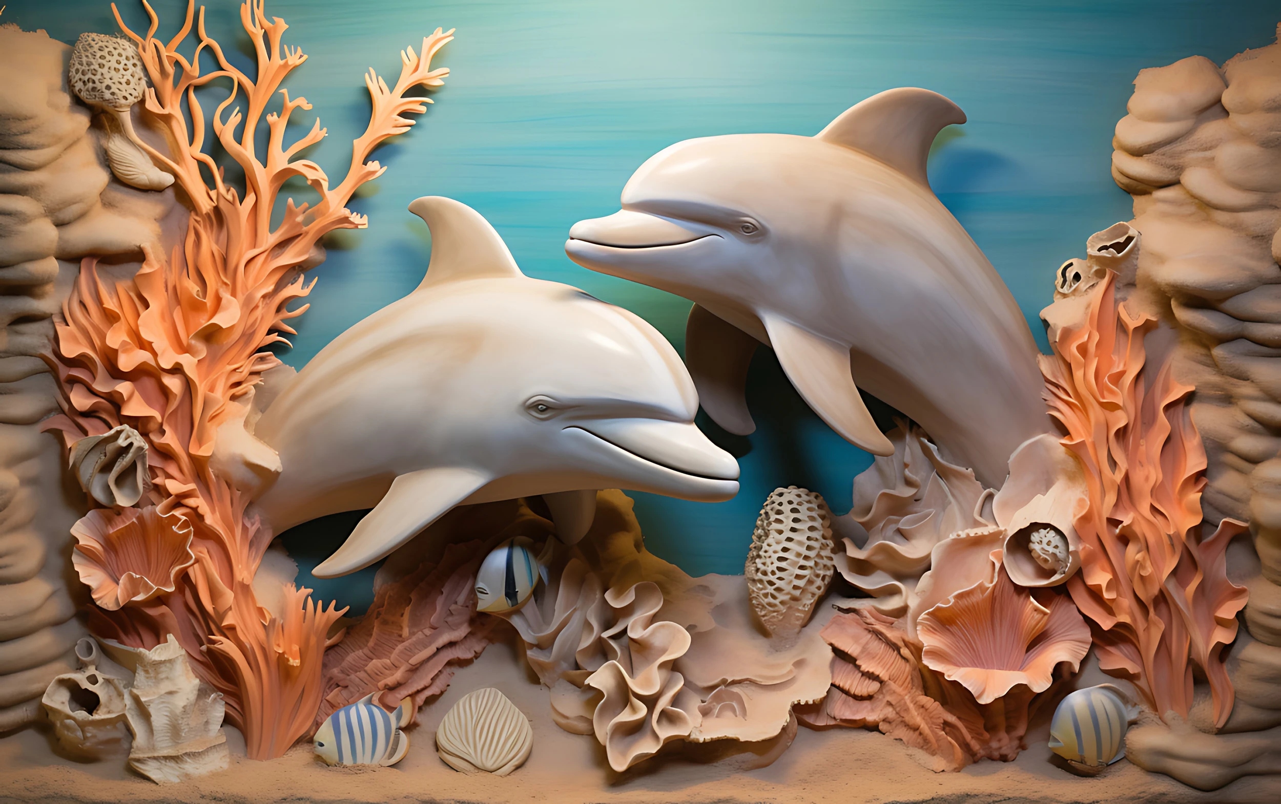 Ce papier peint en relief 3D révèle un univers aquatique fascinant où deux dauphins sculptés évoluent gracieusement au cœur d’un paysage sous-marin d’une précision remarquable. Les mammifères marins, modelés avec un réalisme troublant, semblent jaillir de la paroi dans une danse éternelle, leurs corps fuselés captant subtilement les jeux d’ombre et de lumière.