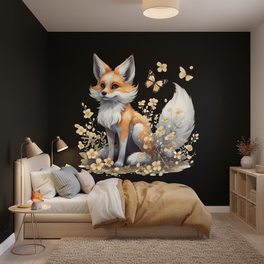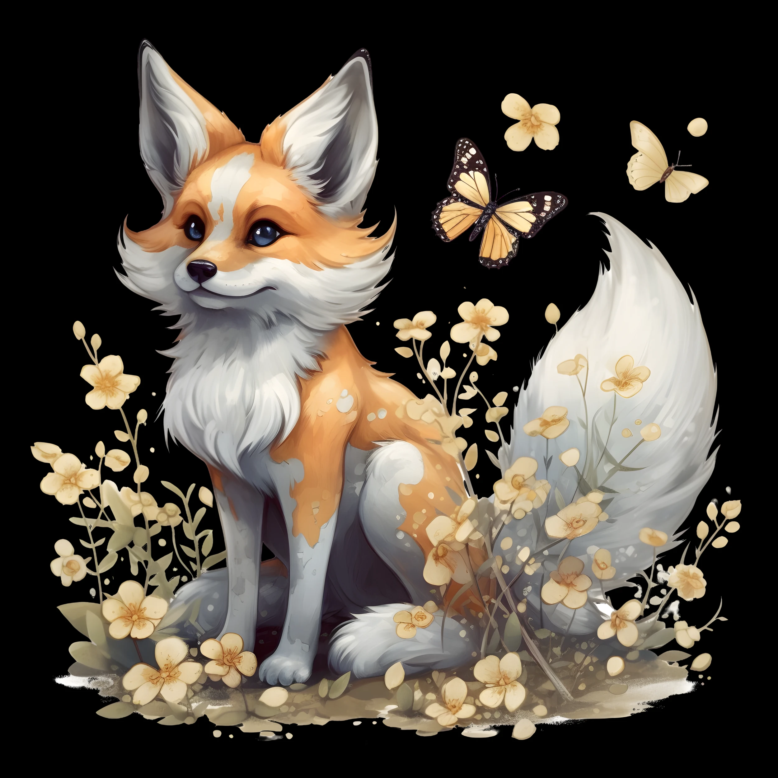 Au cœur de cette composition artistique exceptionnelle, un renard stylisé aux tons orangés et blancs délicats pose son regard malicieux sur un monde enchanteur. Son pelage soyeux, minutieusement détaillé dans un style d’illustration moderne, contraste magnifiquement avec le fond noir profond qui amplifie chaque nuance. Des fleurs dorées aux pétales translucides s’épanouissent autour de lui, créant une symphonie botanique d’une rare élégance. Un papillon aux ailes tachetées voltige gracieusement, ajoutant une dimension poétique à cette scène forestière. L’ensemble révèle une palette chromatique raffinée oscillant entre les tons chauds de miel, les blancs immaculés et les dorés subtils, rehaussés par des touches de noir intense.