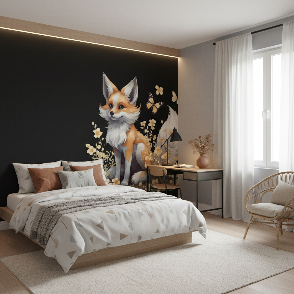 Ce papier peint animaux trouve sa place idéale dans une chambre parentale en quête de caractère, transformant le mur principal en véritable œuvre d’art. Dans un salon contemporain, il s’impose comme un point focal saisissant, particulièrement mis en valeur derrière un canapé en velours gris perle ou un fauteuil en cuir cognac. Pour une chambre d’enfant, il crée un univers onirique propice aux belles histoires du soir. Associez-le à du mobilier en bois naturel, des textiles en lin écru et des accessoires en laiton brossé pour créer une harmonie parfaite. Les tons dorés du papier peint s’accordent merveilleusement avec des coussins ocre, des plaids en mohair crème et quelques touches de vert sauge.