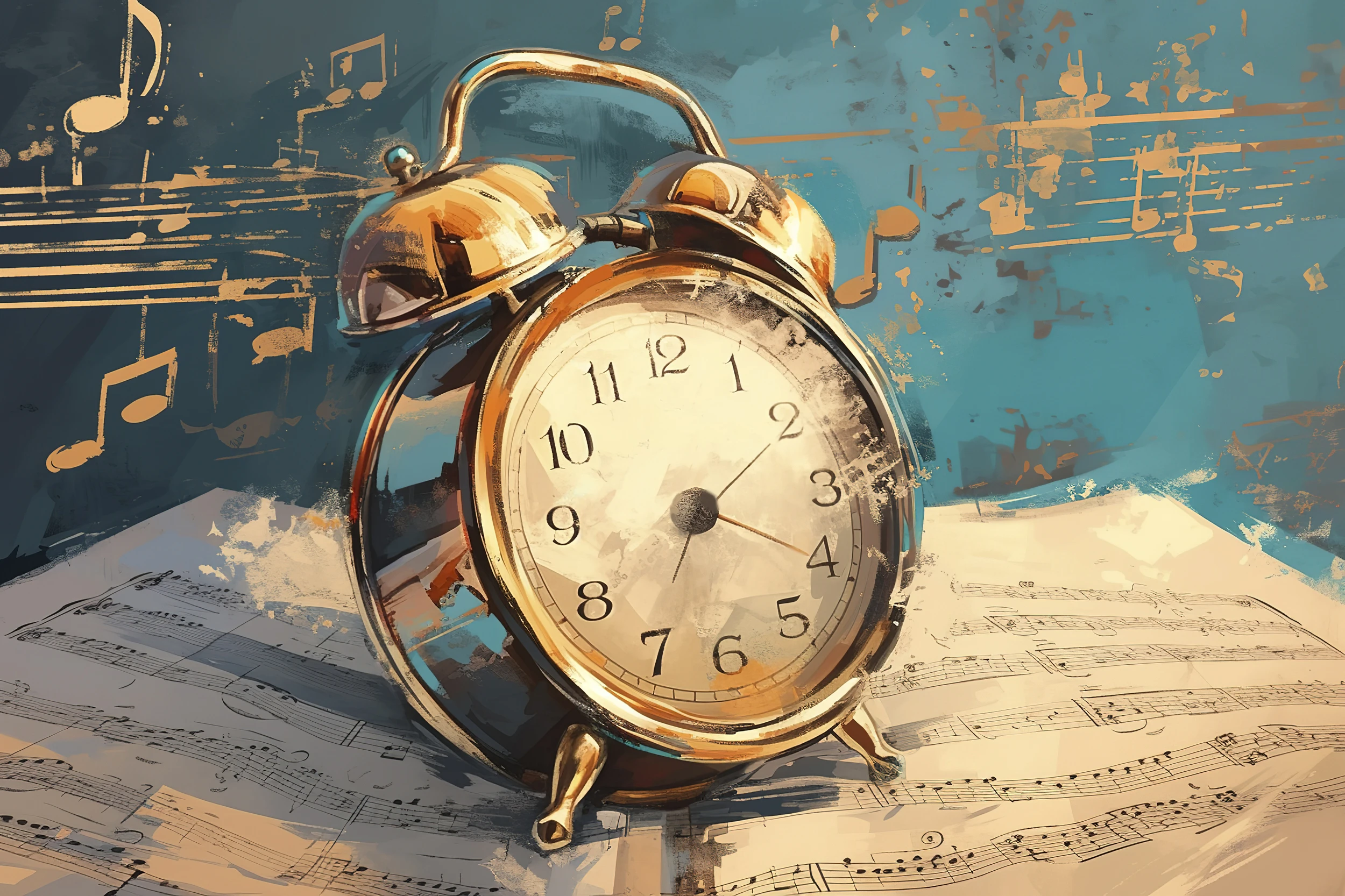Au cœur de cette composition artistique, un magnifique réveil mécanique doré aux lignes classiques occupe l’espace central, ses aiguilles figées dans un instant d’éternité. Les cloches jumelles scintillent sous un éclairage chaleureux, évoquant les réveils d’autrefois où la musique du temps rythmait les journées. Autour de cet objet emblématique, des partitions musicales anciennes se déploient en douceur, leurs portées et leurs notes créant un ballet graphique d’une élégance rare.