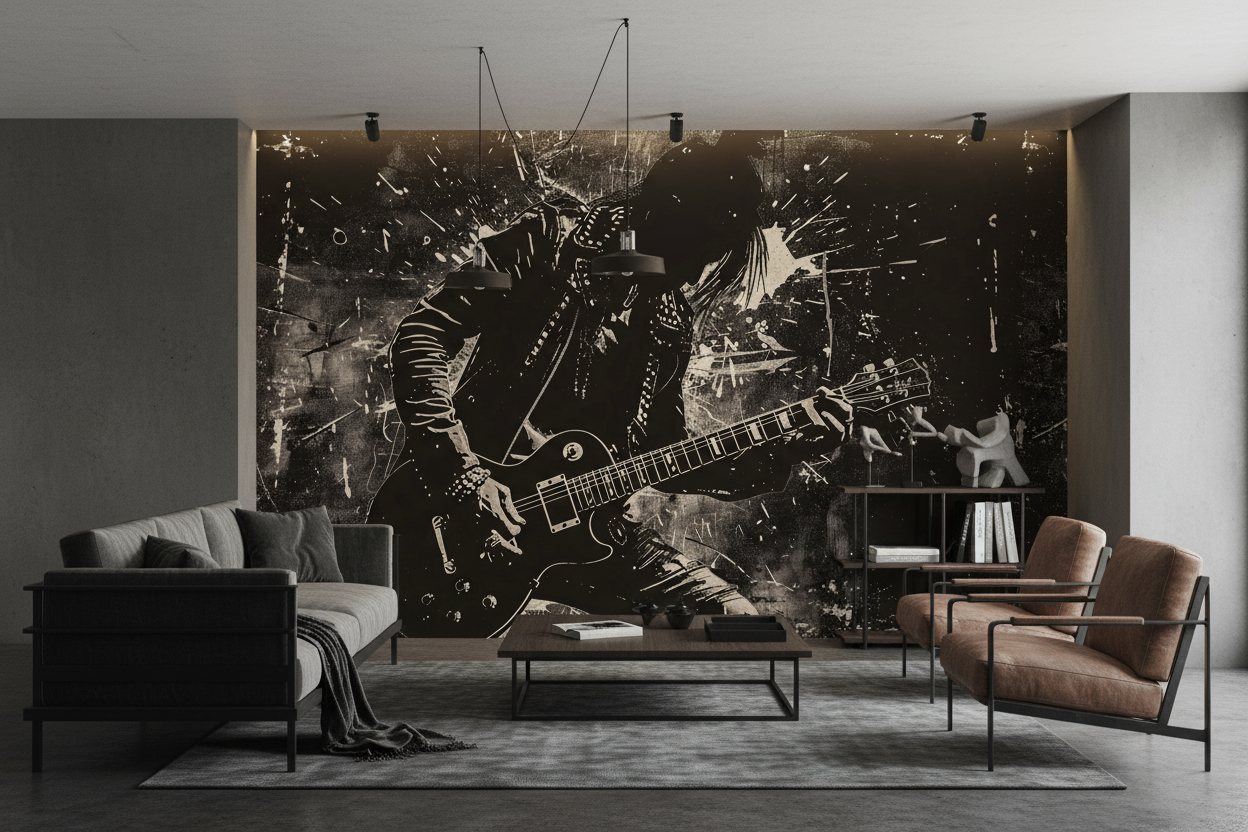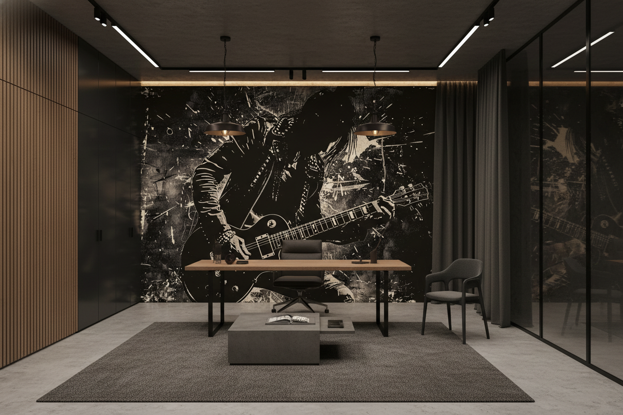 Ce papier peint décoratif rock trouve également sa place dans un home studio, un bar privé ou une salle de jeux moderne. Associé à des teintes comme le bordeaux profond, l’orange rouille ou le vert olive, il révèle toute sa personnalité. Les matières brutes comme le béton ciré, la brique apparente ou l’acier patiné créent un dialogue esthétique des plus réussis.