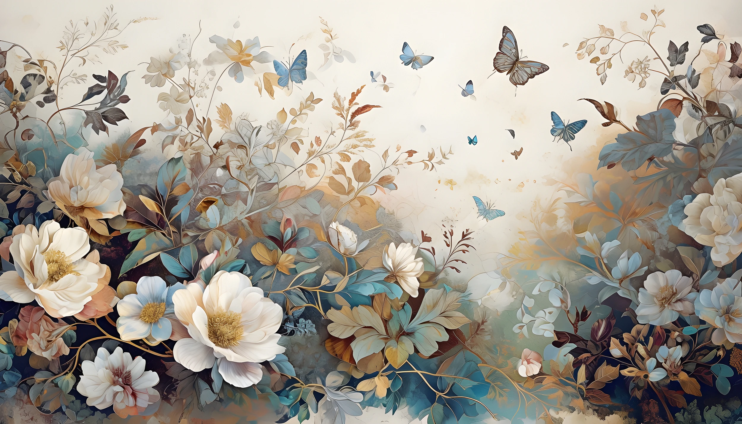 Ce papier peint floral déploie une composition artistique d’une délicatesse saisissante, mêlant pivoines blanches aux cœurs dorés, magnolias soyeux et roses sauvages dans un entrelacs végétal sophistiqué. Les papillons aux ailes bleu azur semblent prendre leur envol depuis cette prairie enchantée, créant un mouvement perpétuel qui captive le regard. Le style graphique s’apparente à une aquarelle délicate, où chaque pétale révèle des nuances subtiles allant du blanc nacré au crème doré, tandis que le feuillage se décline dans une palette de verts jade, bleus poudrés et ocres automnaux. Les branches sinueuses créent une architecture naturelle qui structure harmonieusement cette fresque murale d’inspiration romantique.