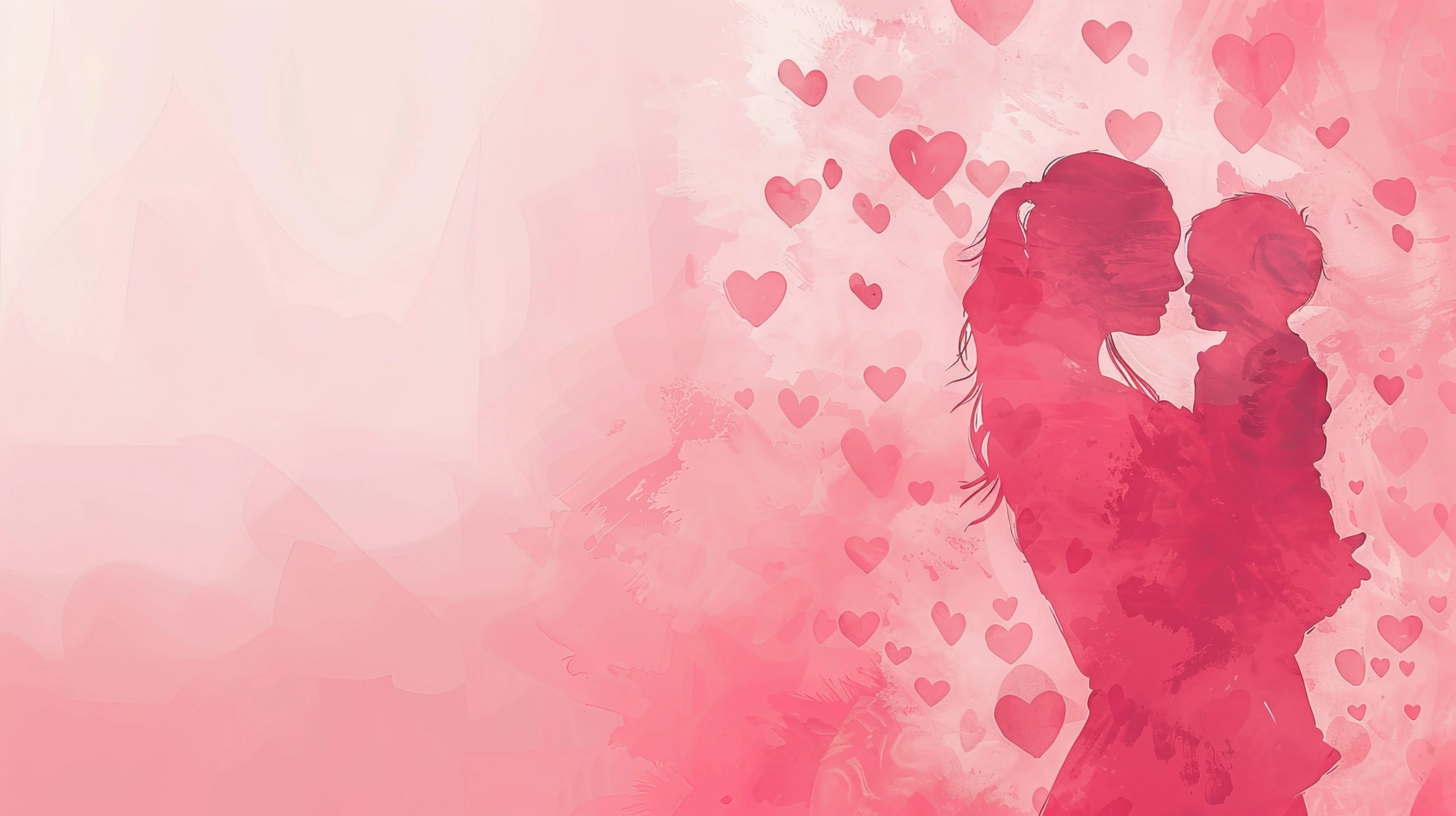Ce papier peint romantique révèle la silhouette fusionnelle de deux amoureux enlacés, peinte dans un style aquarelle contemporain d’une beauté saisissante. Les teintes rose corail et rouge vermillon se mélangent harmonieusement sur un fond rose poudré nuancé de blanc nacré. Une nuée de cœurs flottants s’élève autour du couple, créant un mouvement ascendant qui évoque l’élévation des sentiments. La technique picturale, aux allures d’illustration moderne, joue sur les transparences et les dégradés pour créer une atmosphère vaporeuse et onirique.