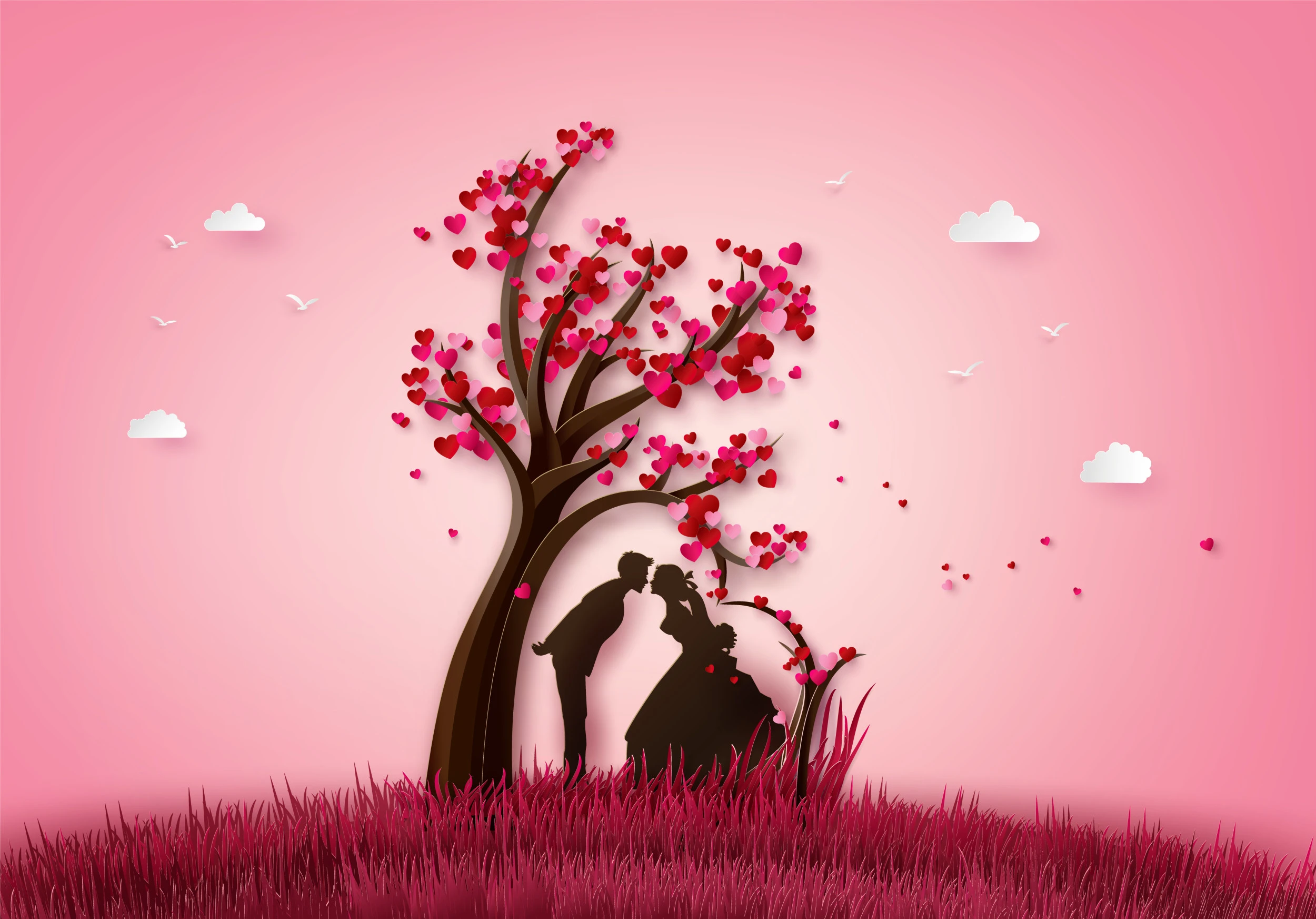 Ce papier peint romantique capture un instant de pure tendresse avec ses silhouettes d’amoureux enlacés sous un majestueux arbre aux cœurs. L’illustration, réalisée dans un style papier découpé sophistiqué, joue sur les contrastes saisissants entre les ombres noires des personnages et la délicatesse des cœurs roses et rouges qui s’échappent des branches comme une pluie de sentiments. Le dégradé rose du ciel, allant du rose poudré au rose soutenu, crée une atmosphère douce et enveloppante, ponctuée de petits nuages blancs et d’oiseaux en vol qui ajoutent une dimension poétique à l’ensemble.