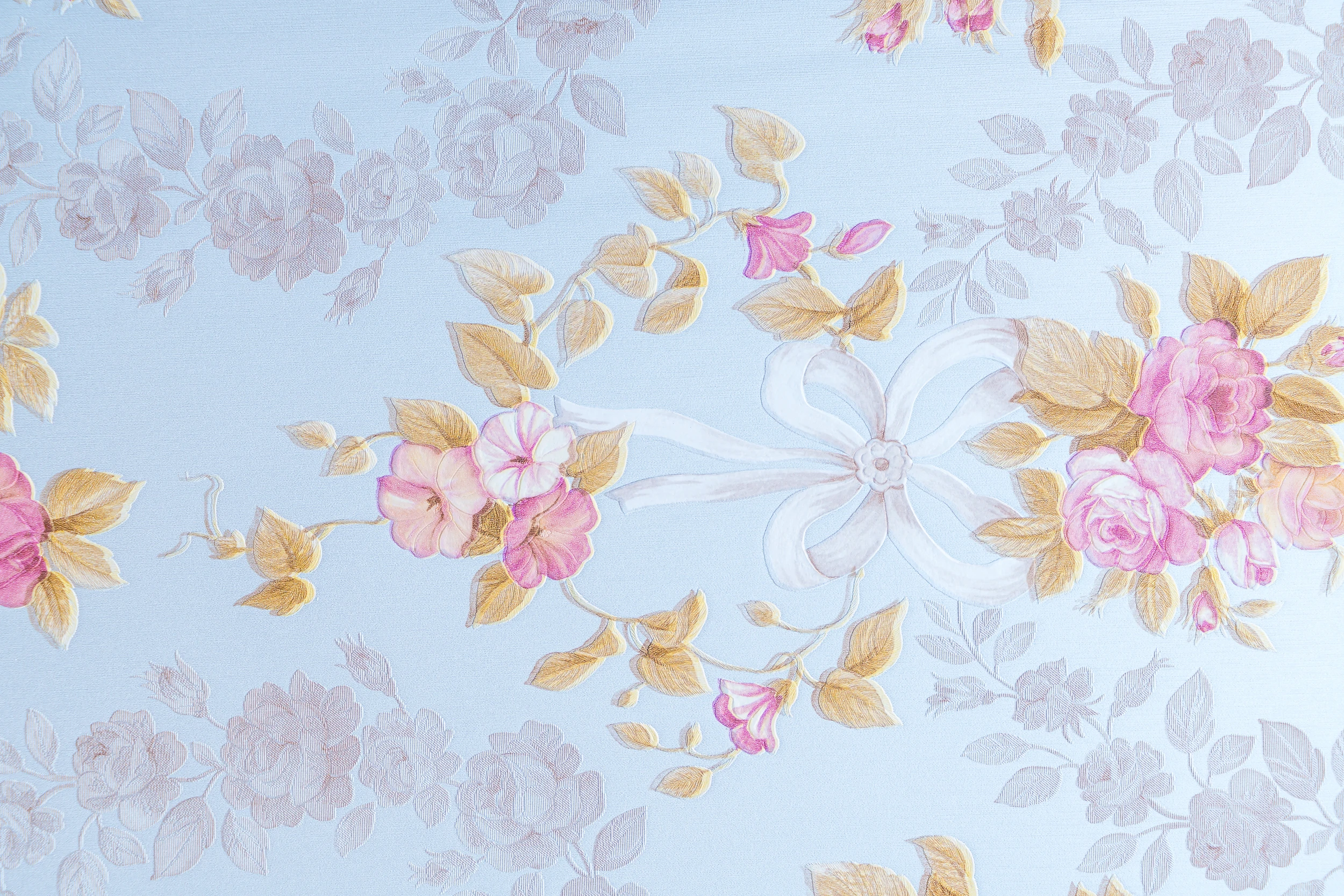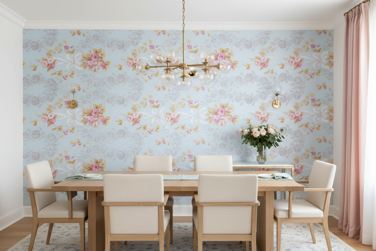 Ce papier peint floral romantique révèle un univers enchanteur où se mêlent harmonieusement roses roses aux pétales veloutés, délicates fleurs blanches translucides et feuillage doré aux reflets cuivrés. Sur un fond bleu ciel tendre, parsemé de motifs floraux gris en filigrane, cette composition florale évoque l’art délicat de l’aquarelle romantique. Les branches fleuries serpentent gracieusement, créant un mouvement naturel et aérien qui transforme votre mur en véritable toile artistique.