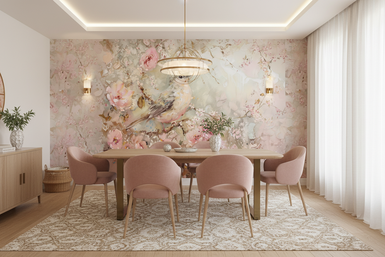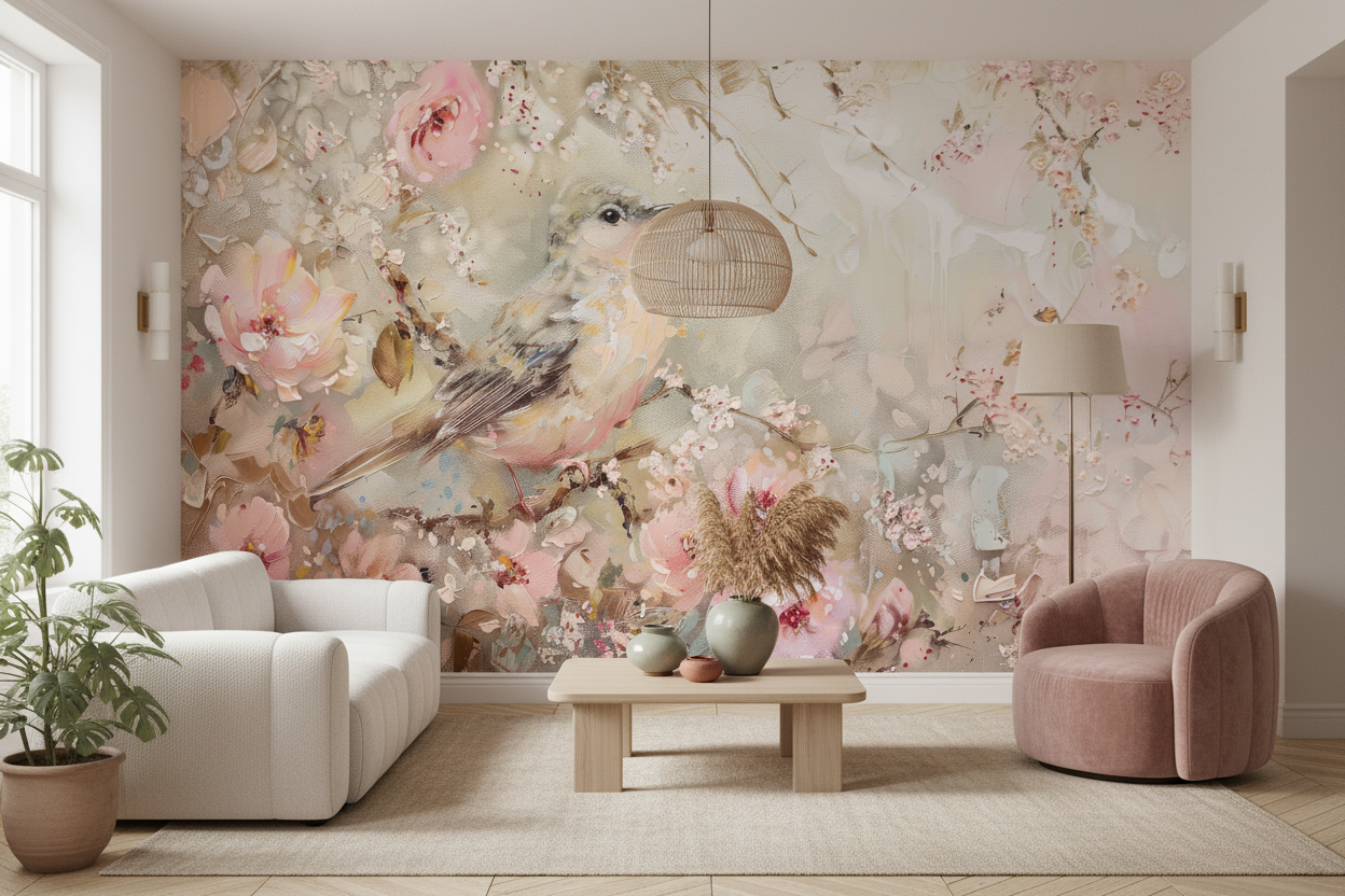 Ce papier peint romantique insuffle une atmosphère de quiétude absolue, transformant votre espace en un cocon de douceur féminine. L’ambiance créée évoque un matin de printemps dans un jardin secret, où chaque regard posé sur cette œuvre murale devient une invitation à la contemplation. La présence délicate de l’oiseau apporte une dimension vivante et poétique, créant un sentiment d’harmonie avec la nature.