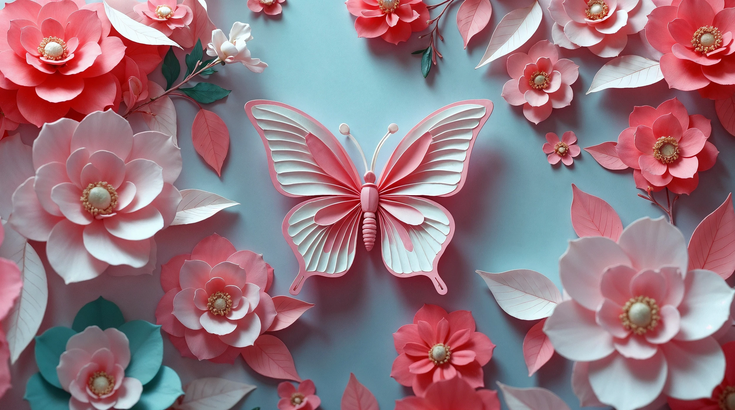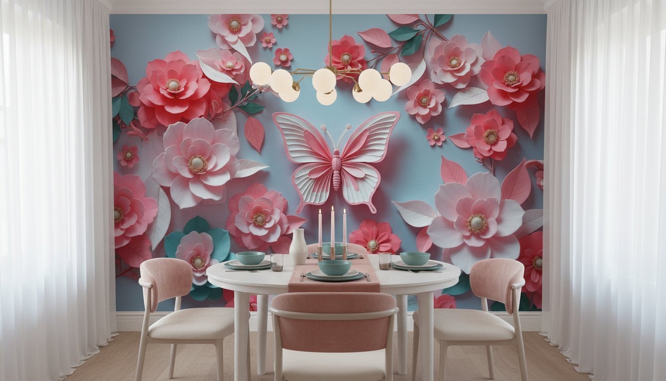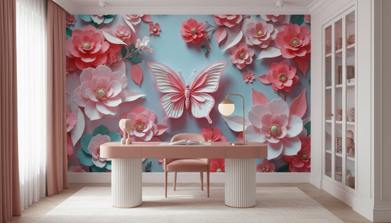 Ce papier peint floral 3D révèle un univers artistique d’une délicatesse remarquable, où s’épanouissent de somptueuses fleurs roses et corail aux pétales savamment sculptés. Au cœur de cette composition florale, un papillon aux ailes déployées semble prendre son envol, créant un point focal d’une grâce saisissante. Les motifs en relief confèrent une profondeur exceptionnelle à l’ensemble, tandis que les nuances s’étendent du rose poudré au corail vibrant, ponctuées de touches d’or nacré au centre de chaque corolle. La technique du paper art utilisée ici évoque l’art du quilling et de la sculpture papier, offrant un rendu visuel d’une sophistication rare.
