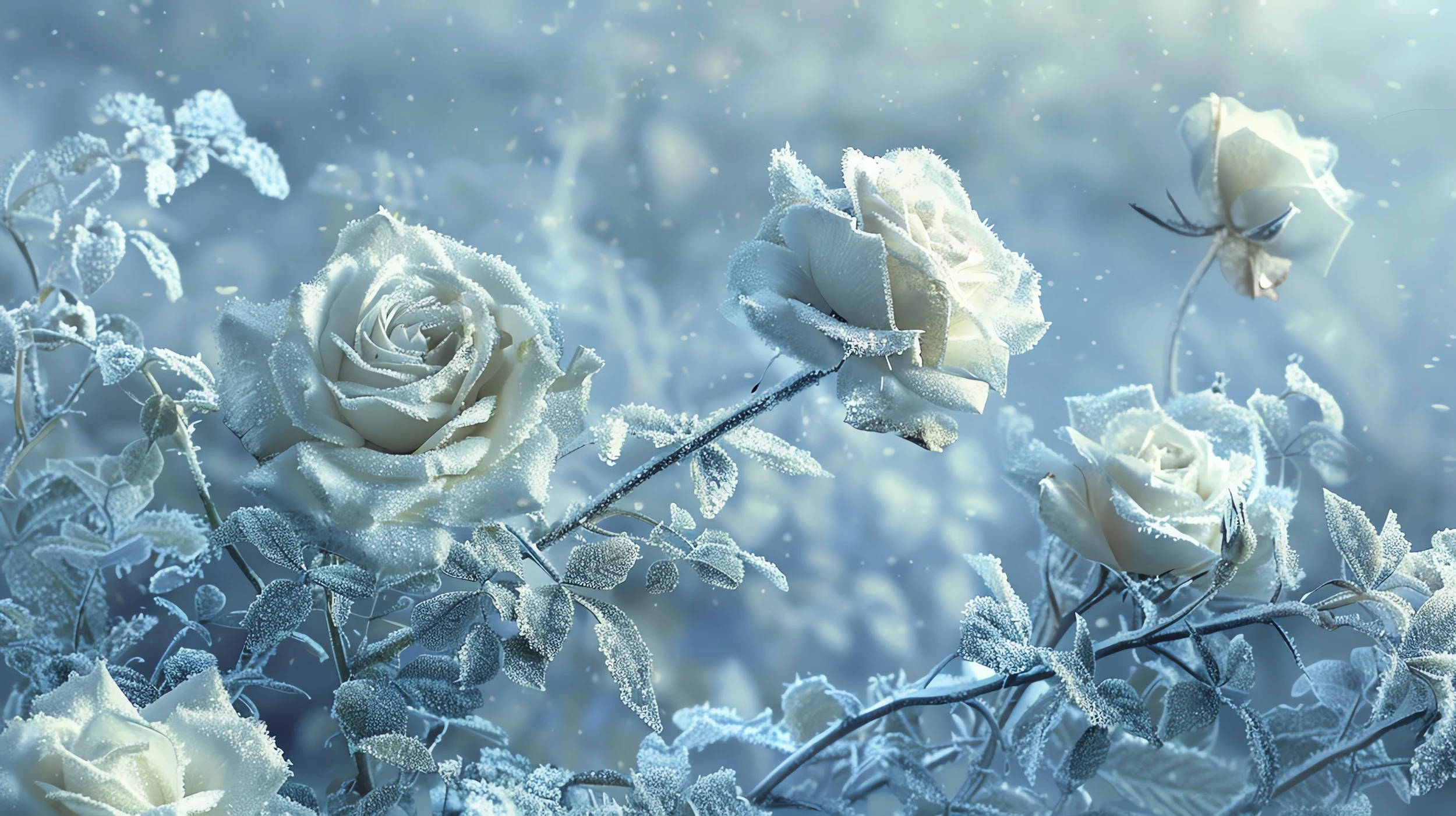 Cette composition florale extraordinaire révèle des roses blanches délicates figées dans leur splendeur par un manteau de givre étincelant. Chaque pétale sculpté par le froid scintille sous une lumière poudrée, créant un effet de matière d’une finesse remarquable. Le style photographique ultra-réaliste capture avec une précision époustouflante les détails de la cristallisation : les feuilles dentelées aux contours soulignés de blanc immaculé, les tiges élancées perlées de rosée glacée, et cette atmosphère vaporeuse où dansent de délicates particules de neige.