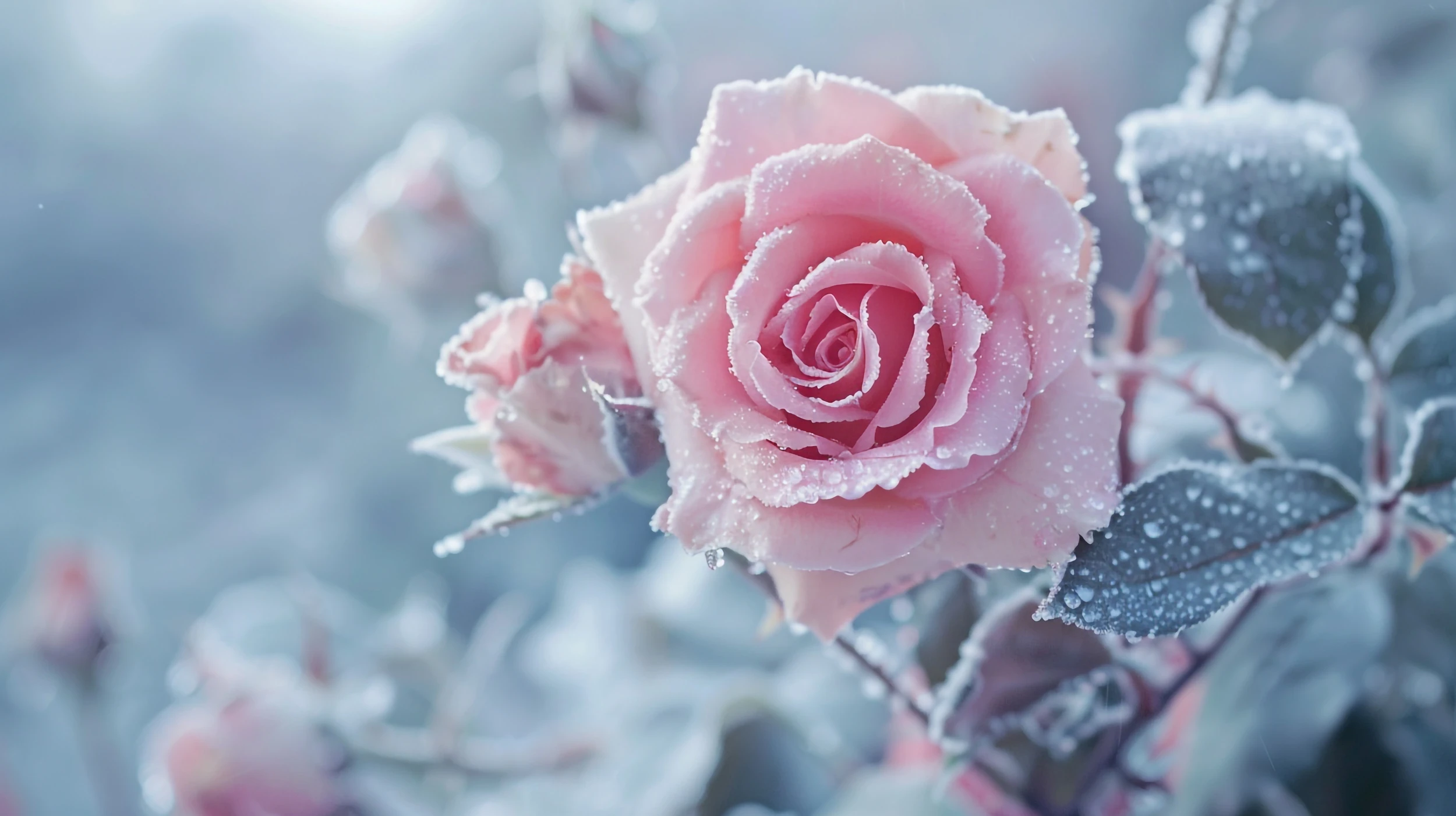 Ce papier peint floral capture avec une poésie saisissante l’instant magique où les roses roses se parent de leur manteau hivernal. Les fleurs délicates aux nuances poudrées s’épanouissent dans un camaïeu de rose tendre et corail, leurs pétales veloutés contrastant magnifiquement avec le feuillage bleu-gris givré. Cette photographie florale haute définition révèle chaque détail avec une précision remarquable : les gouttelettes de rosée cristallisées, la texture soyeuse des pétales, l’architecture parfaite de chaque corolle qui se déploie en spirales harmonieuses.