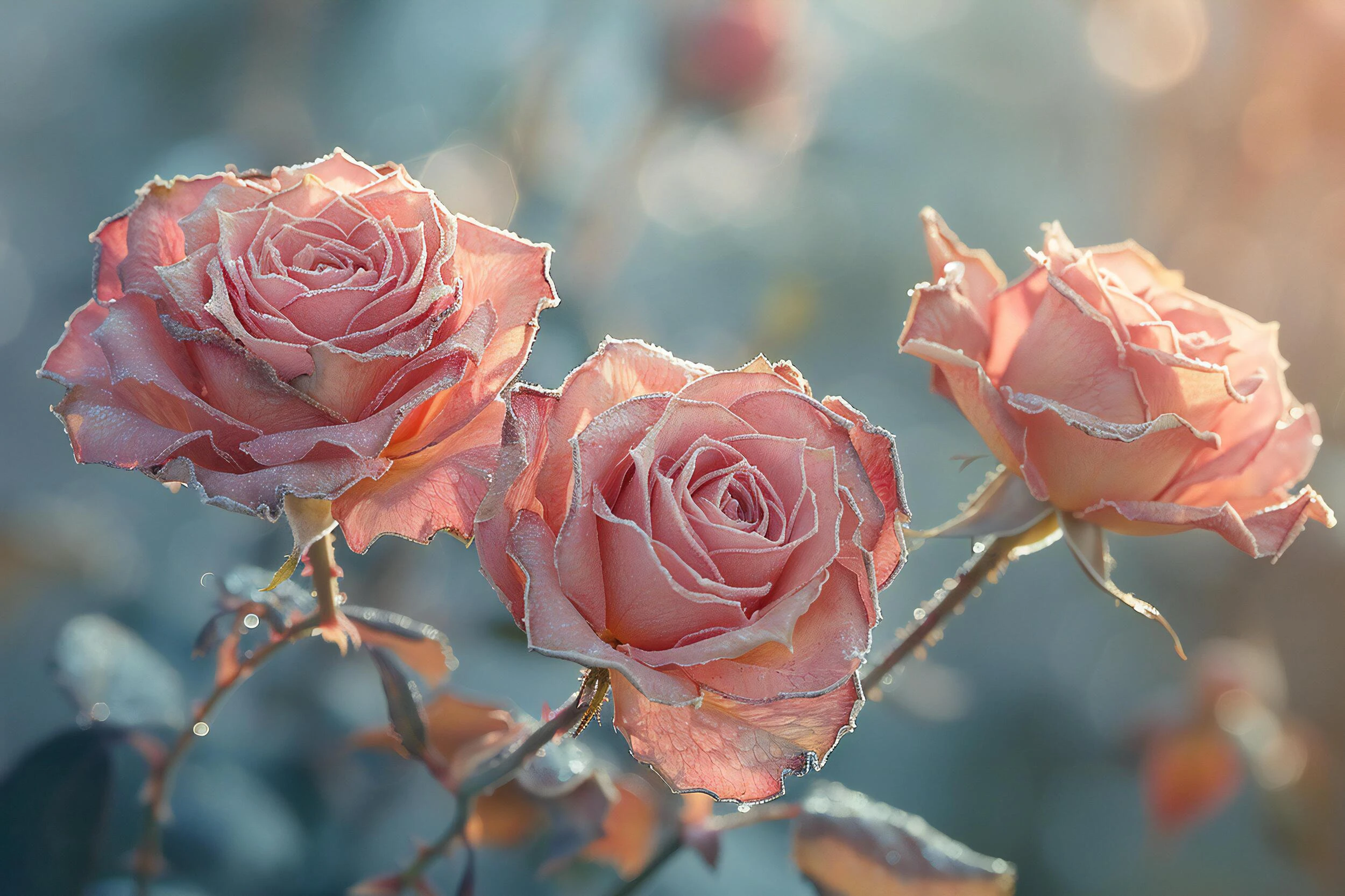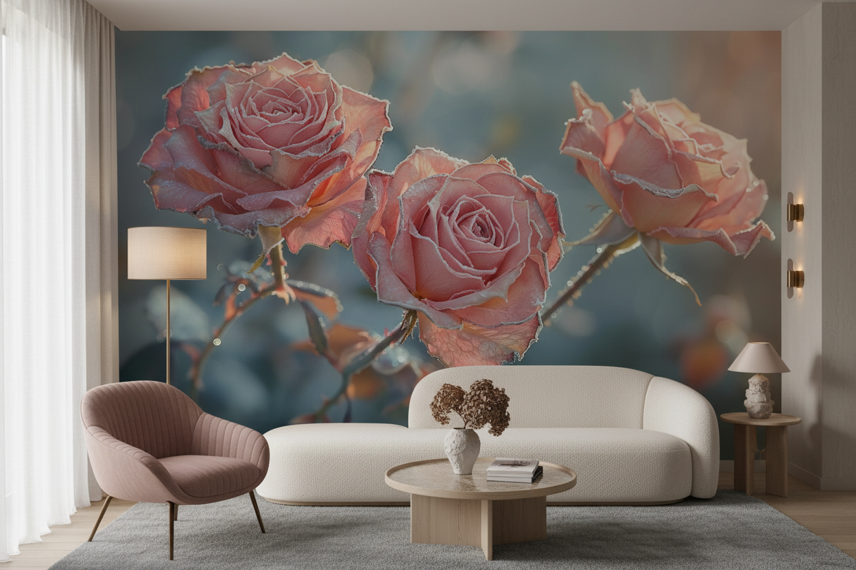 Ce papier peint floral romantique révèle trois magnifiques roses aux teintes corail et saumon, délicatement ourlées d’un liseré argenté qui évoque la poésie d’un matin d’hiver. Le style photographique haute définition confère à cette création murale un réalisme saisissant, où chaque détail botanique se dessine avec une précision d’orfèvre. Les nuances rosées et pêche se mêlent harmonieusement aux reflets cuivrés, créant une palette chromatique d’une douceur absolue. L’arrière-plan aux tons bleu-gris délicatement floutés apporte une profondeur contemplative, tandis que les effets de lumière naturelle transforment cette composition florale en véritable tableau vivant.