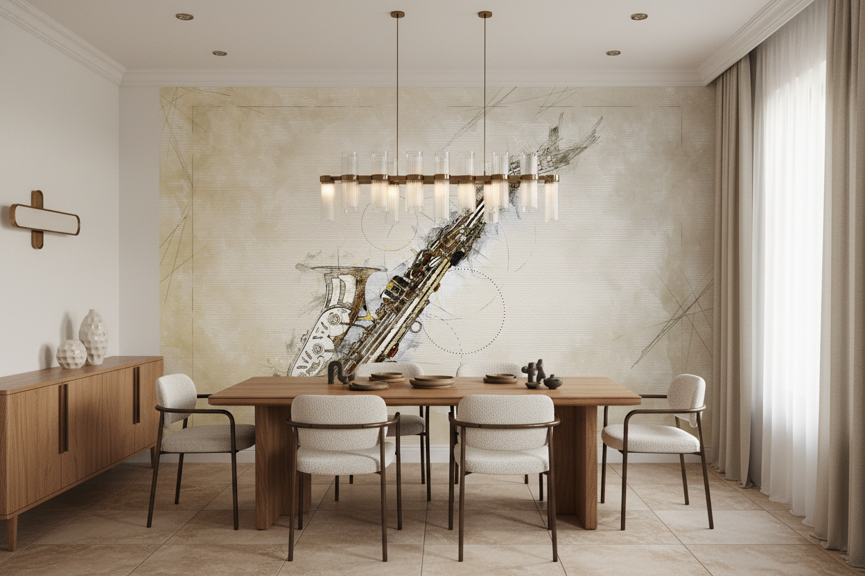Les notes cristallines d’un saxophone doré semblent s’échapper de ce papier peint d’exception, transformant votre intérieur en une partition visuelle où l’art et la musique fusionnent dans une harmonie parfaite.