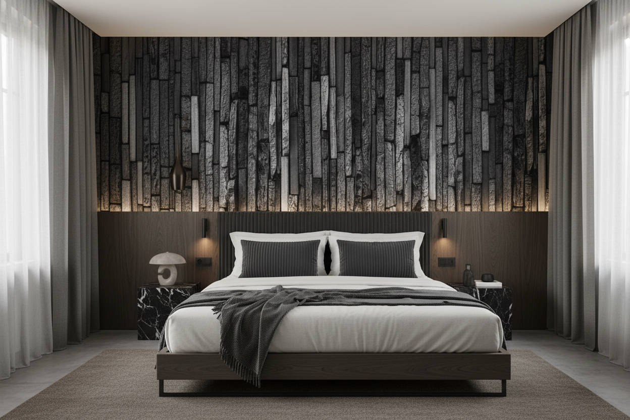 La palette monochrome révèle une symphonie de gris nuancés, du charbon le plus profond aux tons pierre les plus délicats. Cette décoration murale minéraliste crée une ambiance à la fois authentique et contemporaine, où la noblesse du matériau brut rencontre l’élégance du design moderne. Les jeux d’ombres et de lumières accentuent la profondeur naturelle de cette texture, créant un relief visuel captivant qui transforme instantanément l’atmosphère d’une pièce.