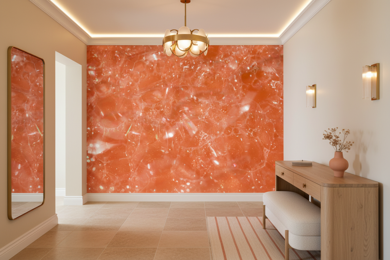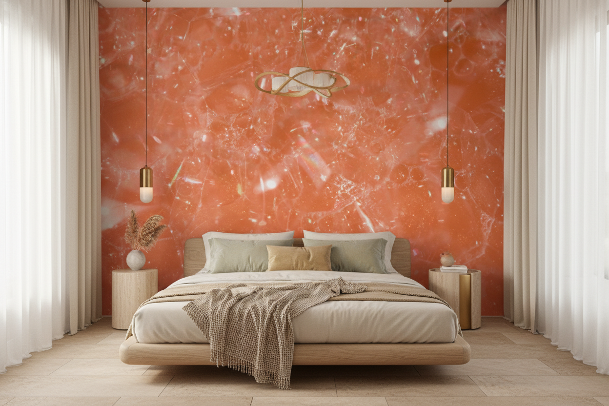 Ce papier peint décoratif minéral trouve sa place idéale dans une chambre parentale, où ses tonalités chaleureuses favorisent un sommeil réparateur. Il sublime également un salon contemporain en tant que mur d’accent, créant un point focal spectaculaire derrière un canapé en velours taupe ou une console en bois de noyer. Pour une salle de bains spa, associez-le à des matières naturelles comme le travertin et le bambou, complétées par des accessoires en laiton brossé. Les tons neutres – blanc cassé, beige lin, gris perle – s’harmonisent parfaitement avec cette palette minérale, tandis qu’un mobilier aux lignes épurées en bois clair ou en métal noir mat accentue l’élégance moderne de l’ensemble.