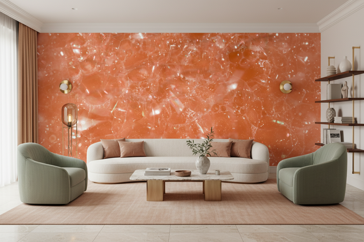 Ce papier peint minéral révèle la beauté brute et sophistiquée d’une formation cristalline aux tons corail et pêche. Les multiples faces géométriques s’entremêlent dans une danse de lumière et d’ombre, créant un relief visuel saisissant. Cette texture cristalline dévoile des nuances subtiles allant du rose poudré au cuivre doré, ponctuées de reflets nacrés qui évoquent la délicatesse d’une pierre semi-précieuse. Le style graphique réaliste reproduit fidèlement la structure naturelle du cristal, révélant chaque arête, chaque plan de clivage avec une précision photographique.