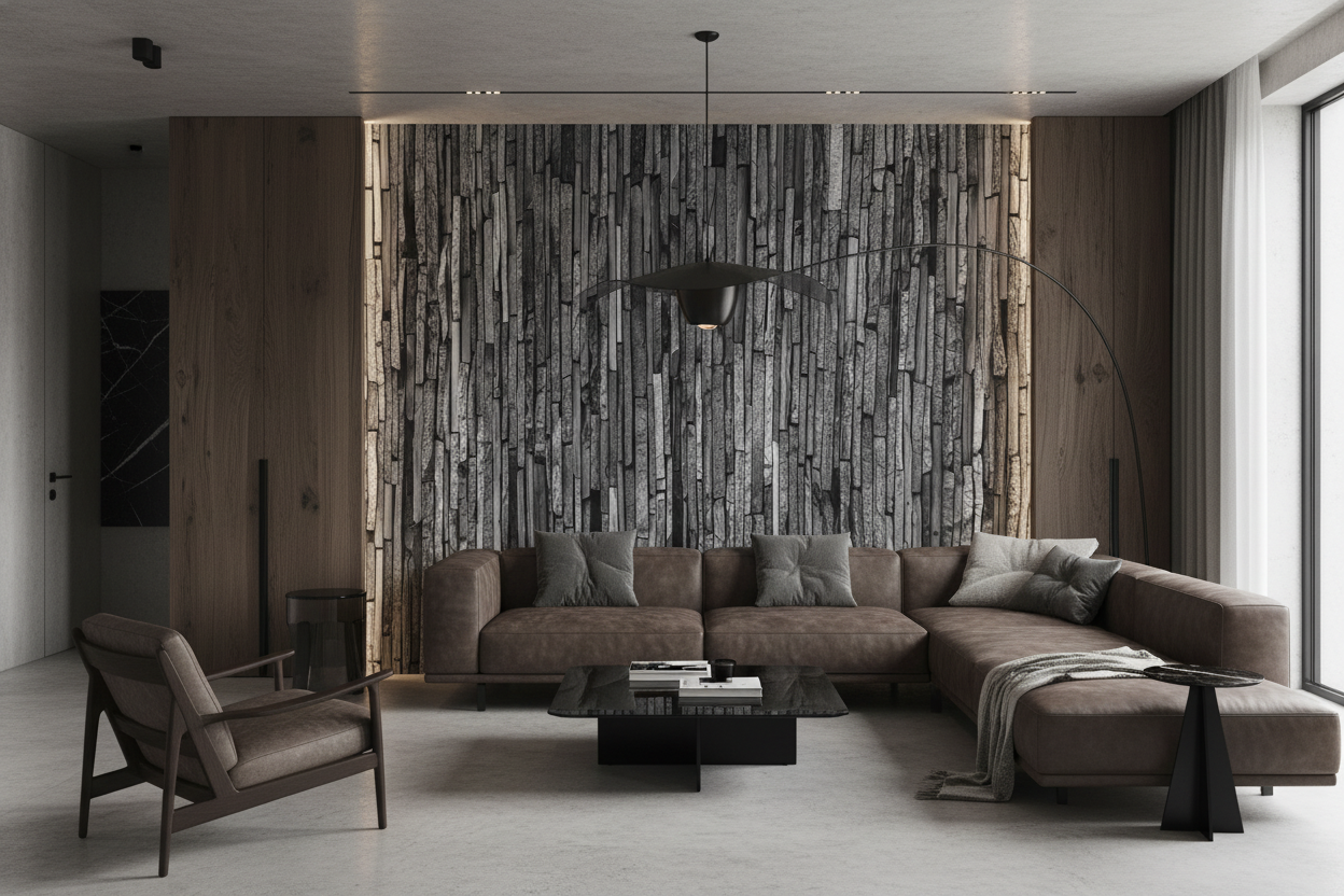 Côté associations décoratives, ce **papier peint texture pierre** se marie harmonieusement avec les **matières naturelles** : bois brut de chêne, lin écru, cuir patiné, et métaux oxydés comme le fer forgé ou l’acier brossé. Les teintes complémentaires idéales oscillent entre les **tons neutres chaleureux** – beiges, taupes, blancs cassés – et les **accents colorés sourds** comme le vert olive, le rouge brique ou l’ocre. Le **mobilier scandinave** aux lignes simples ou les **pièces industrielles** sublimeront parfaitement cette **esthétique minérale contemporaine**.