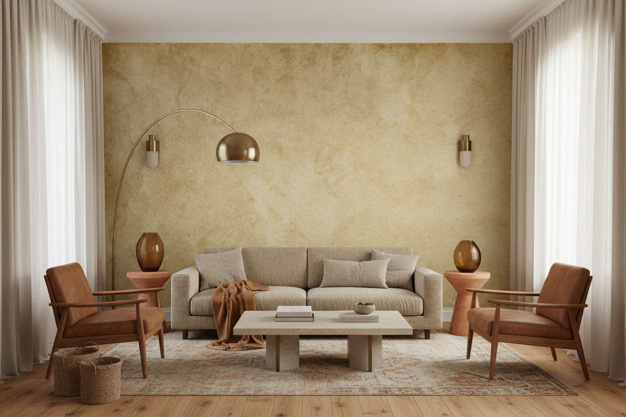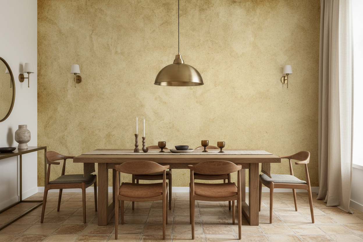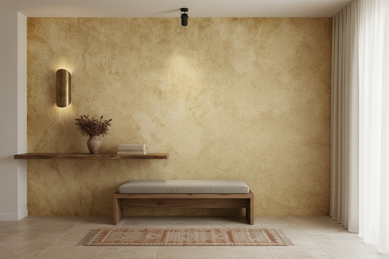 Pour sublimer cette décoration murale texturée, optez pour des accessoires en cuir patiné, des objets chinés et des plantes vertes qui contrastent délicatement avec les tons chauds du revêtement. Les cadres dorés et les miroirs anciens s’harmoniseront parfaitement avec cette esthétique vintage authentique.