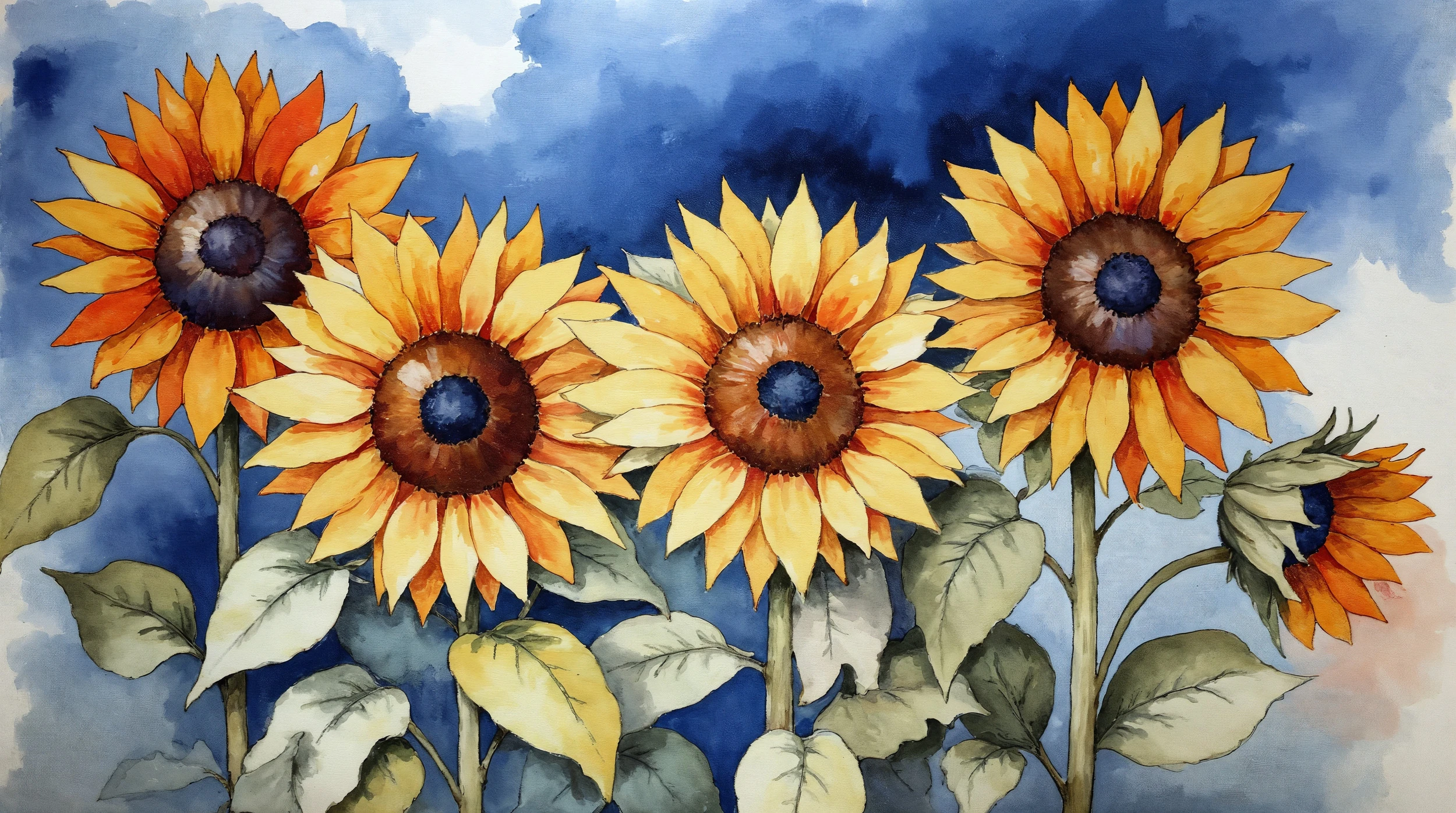 Ce papier peint tournesols révèle une composition florale d’une beauté saisissante, où cinq tournesols majestueux se dressent fièrement vers un ciel d’azur nuageux. L’artiste a su capturer avec une précision remarquable la magnificence de ces fleurs solaires, déployant leurs pétales jaunes orangés dans un dégradé subtil qui va du jaune paille au cuivre flamboyant. Les cœurs bruns aux reflets violacés, minutieusement détaillés, révèlent la texture striée caractéristique du tournesol, tandis que les feuillages verts aux nuances jade et olive apportent une fraîcheur naturelle à l’ensemble.