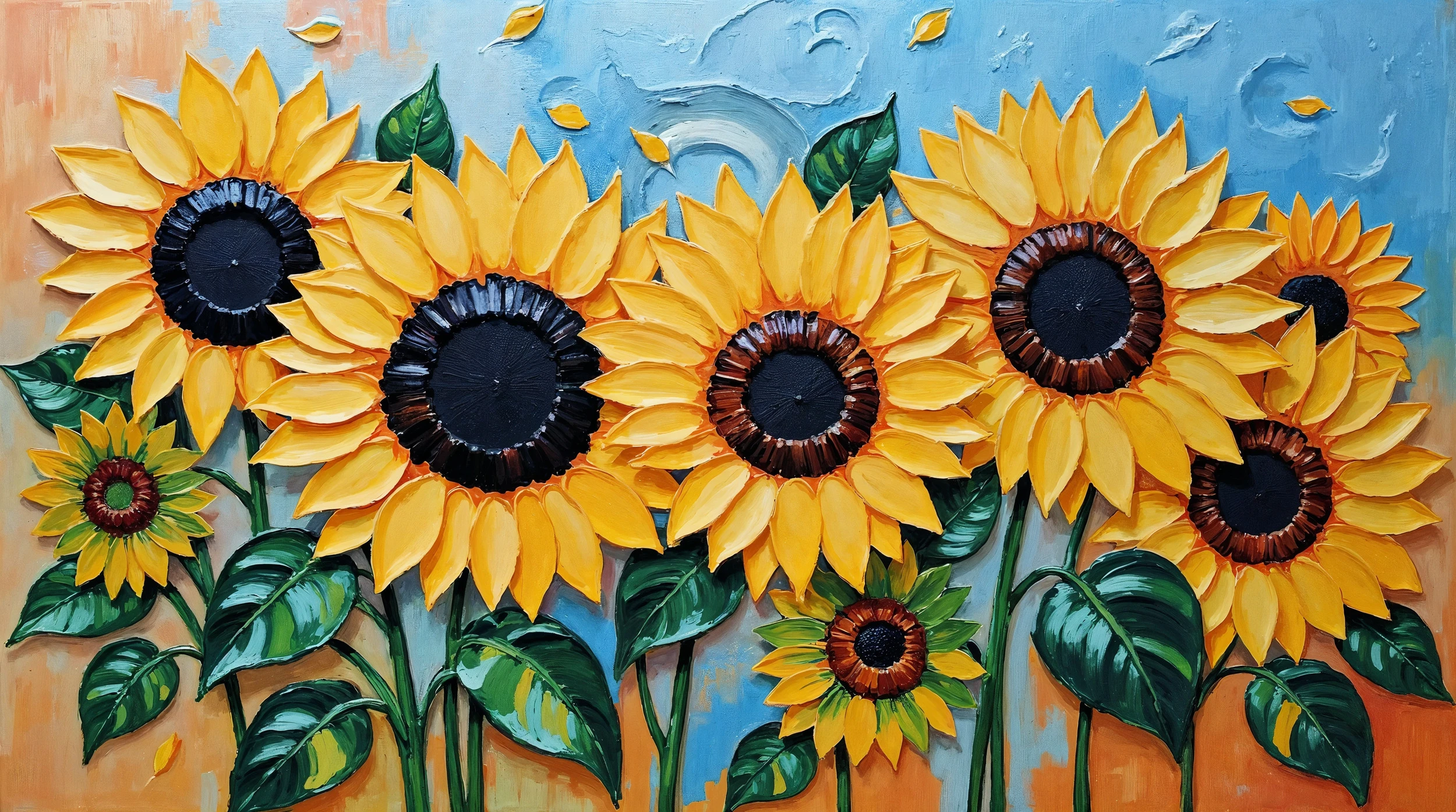 Ce papier peint tournesols aux accents artistiques remarquables révèle une composition florale d’exception, où chaque fleur se dresse fièrement avec ses pétales jaune soleil délicatement nuancés et ses cœurs sombres texturés aux reflets bruns et noirs profonds. Le style graphique, d’inspiration peinture à l’huile, confère à cette création murale une dimension quasi sculpturale grâce à ses reliefs subtils et ses jeux d’ombres sophistiqués. Les feuilles vert émeraude aux nervures finement ciselées accompagnent harmonieusement ces géants floraux, tandis que les tiges robustes s’élancent vers un ciel bleu azur parsemé de nuages cotonneux et de pétales voltigeant dans une brise imaginaire.
