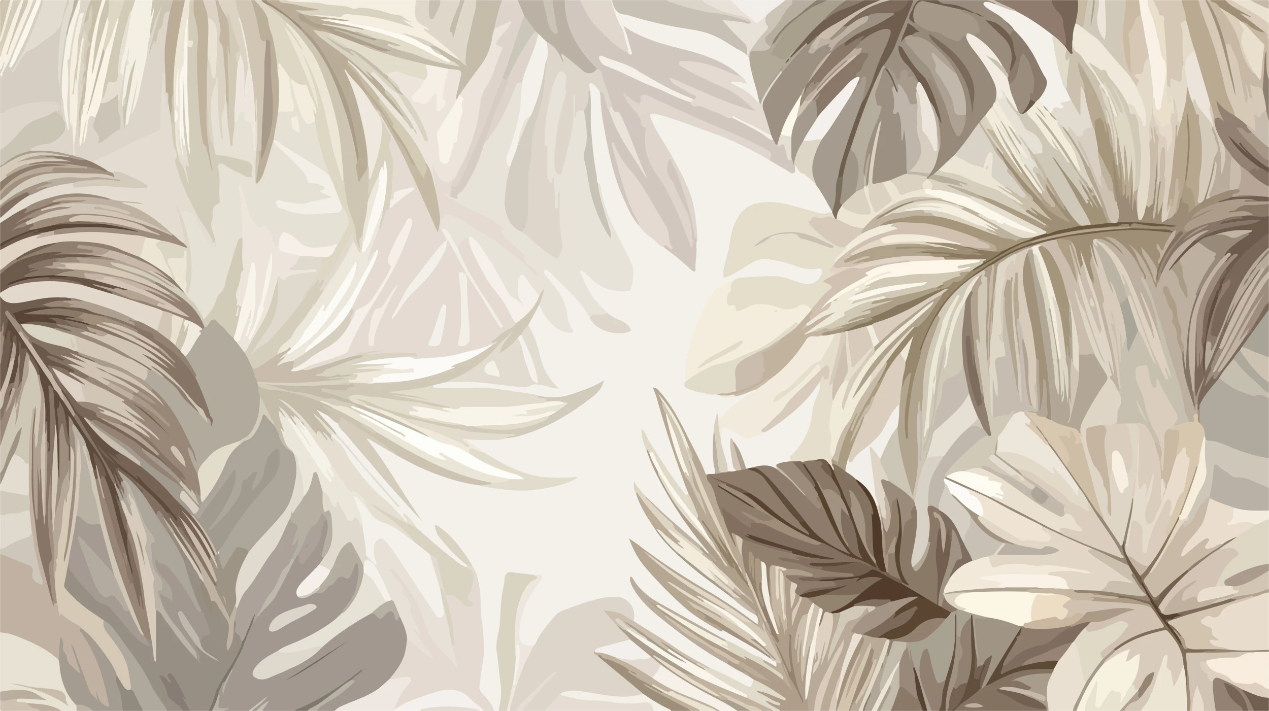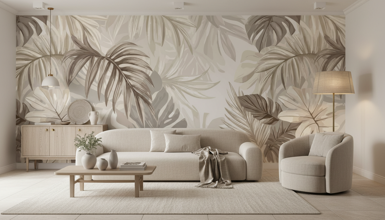 Plongez dans un univers où la nature s’épanouit en nuances poudrées, où chaque feuille murmure des histoires d’évasion tropicale dans une symphonie de beiges dorés et de bruns chaleureux.