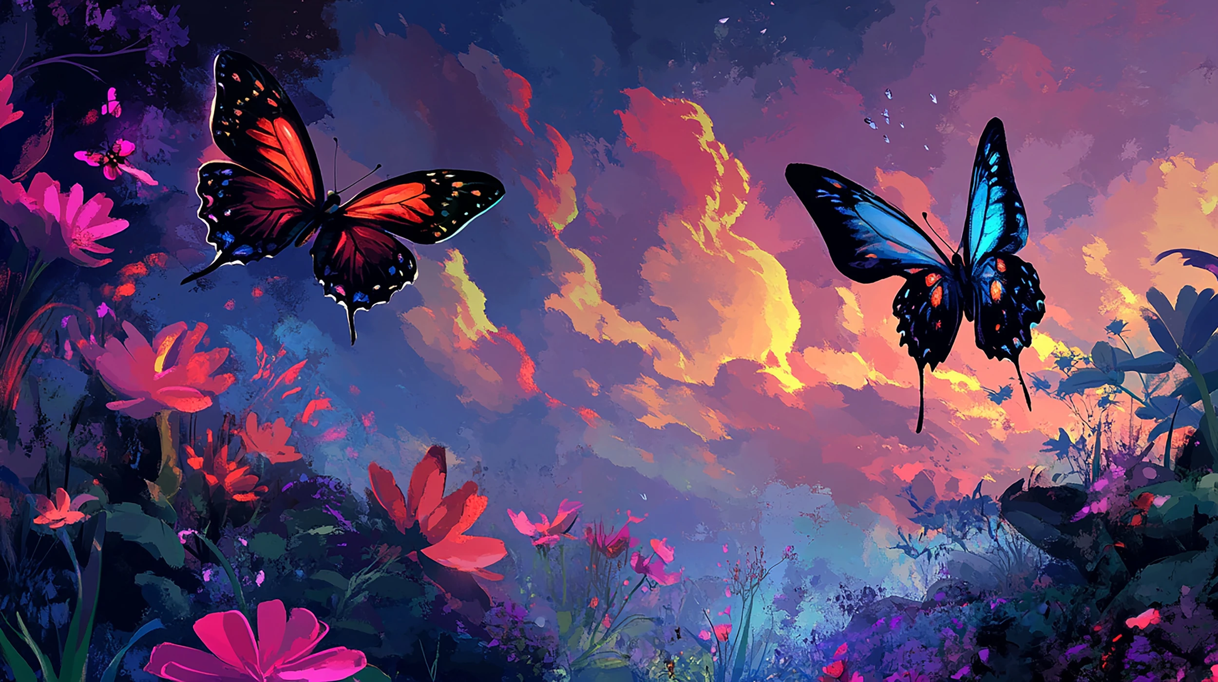Ce papier peint papillons et fleurs sublime révèle un univers enchanté où deux majestueux papillons tropicaux dansent gracieusement au-dessus d’un jardin fantasmagorique. Le premier papillon déploie ses ailes dans des nuances de rouge vermillon et d’orange flamboyant, parsemées de délicates touches dorées, tandis que le second arbore un plumage d’un bleu électrique profond aux reflets métalliques saisissants. Cette peinture murale décorative de style artistique contemporain mêle habilement réalisme et fantaisie, créant un effet pictural d’une richesse visuelle exceptionnelle.