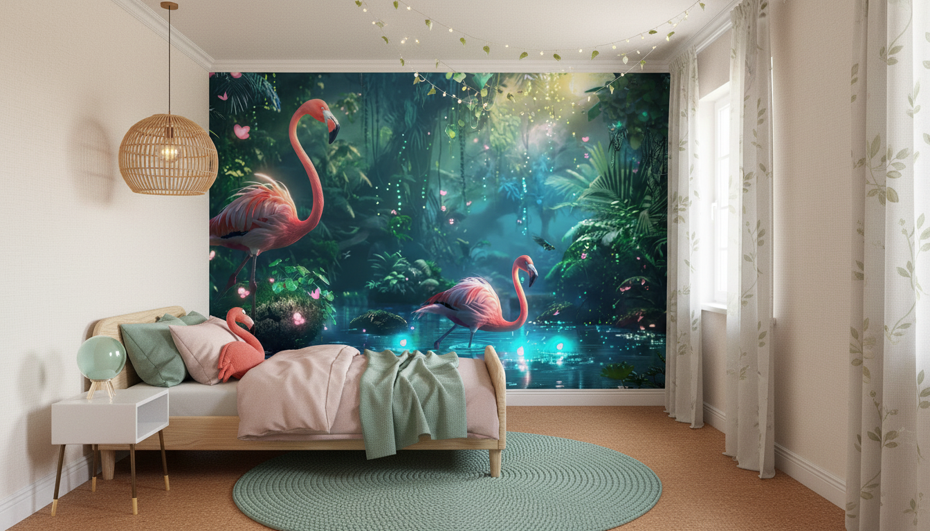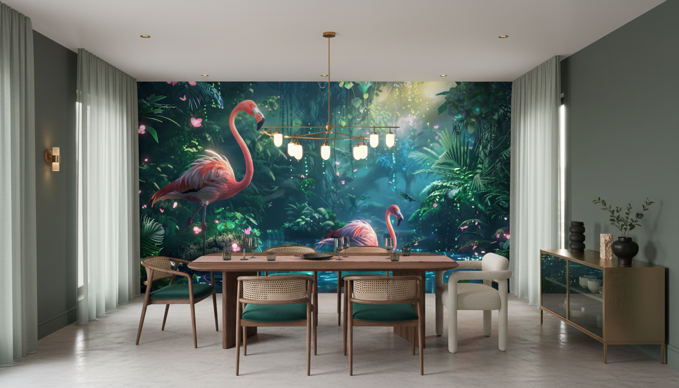 L’artiste a su capturer la magie de la lumière tropicale à travers des jeux d’ombres et de lumières d’une subtilité remarquable. Les tons verts émeraude de la jungle se marient harmonieusement avec les nuances rose corail du plumage des flamants, tandis que des éclats dorés viennent sublimer l’ensemble. Des particules lumineuses flottent dans l’air, évoquant la poussière d’or d’un coucher de soleil en forêt équatoriale, conférant à cette fresque murale tropicale une dimension quasi mystique.