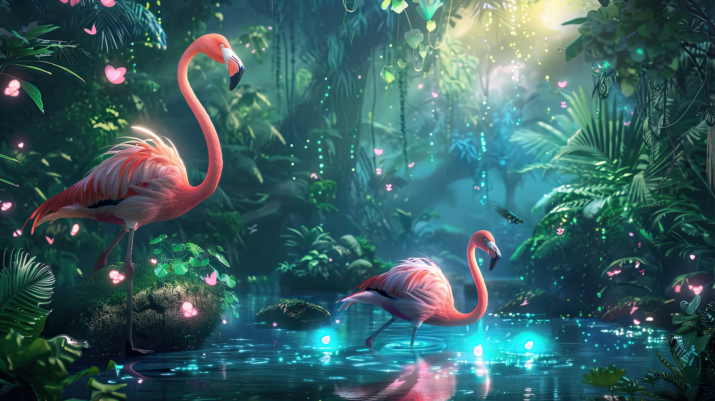 Laissez-vous transporter dans un sanctuaire tropical féerique où la majesté des flamants roses danse au rythme de la lumière dorée filtrant à travers une canopée luxuriante. Ce papier peint jungle enchantée révèle un univers où la réalité se mêle au rêve, créant une atmosphère d’une beauté saisissante.