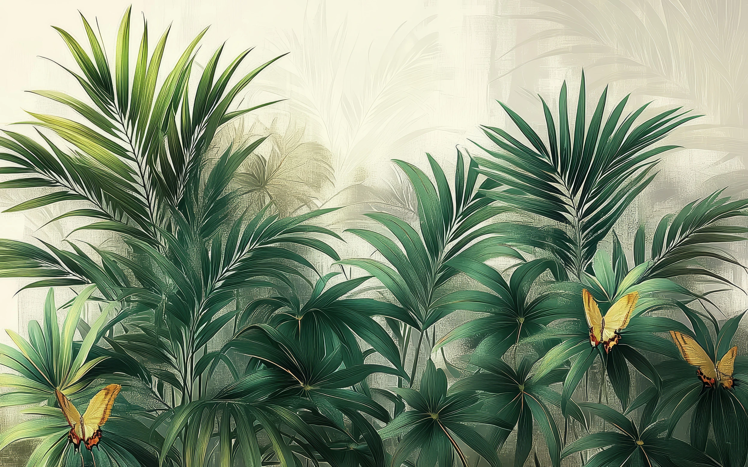 Ce papier peint tropical révèle un univers botanique d’une richesse extraordinaire, où de majestueuses palmes exotiques se dressent avec grâce vers la lumière. Les feuilles de palmier aux nervures finement ciselées côtoient d’imposantes plantes tropicales aux feuillages luxuriants, créant une composition végétale d’une sophistication remarquable. De délicats papillons dorés virevoltent entre les frondaisons, apportant une touche de vie et de mouvement à cette fresque naturelle. Le style graphique, d’un réalisme botanique raffiné, évoque les plus belles illustrations d’histoire naturelle, mêlant précision scientifique et sensibilité artistique. Les tons verts nuancés se déclinent du jade profond au vert tendre, rehaussés par des accents dorés subtils, le tout se détachant sur un fond beige aux reflets nacrés qui évoque la douceur d’un parchemin ancien.
