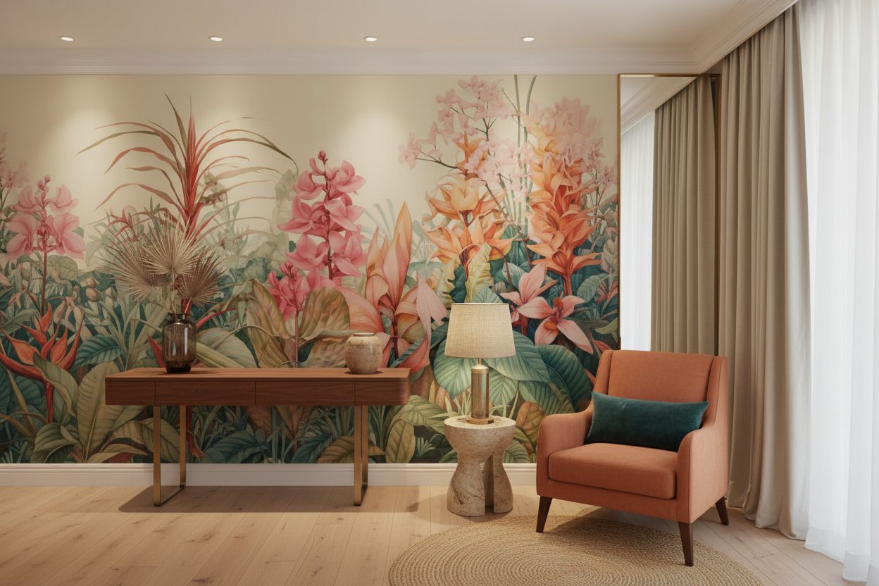 Laissez-vous transporter dans un jardin tropical où les teintes poudrées dansent avec une élégance infinie, créant une symphonie visuelle d’une douceur envoûtante qui transforme instantanément votre intérieur en sanctuaire de sérénité.