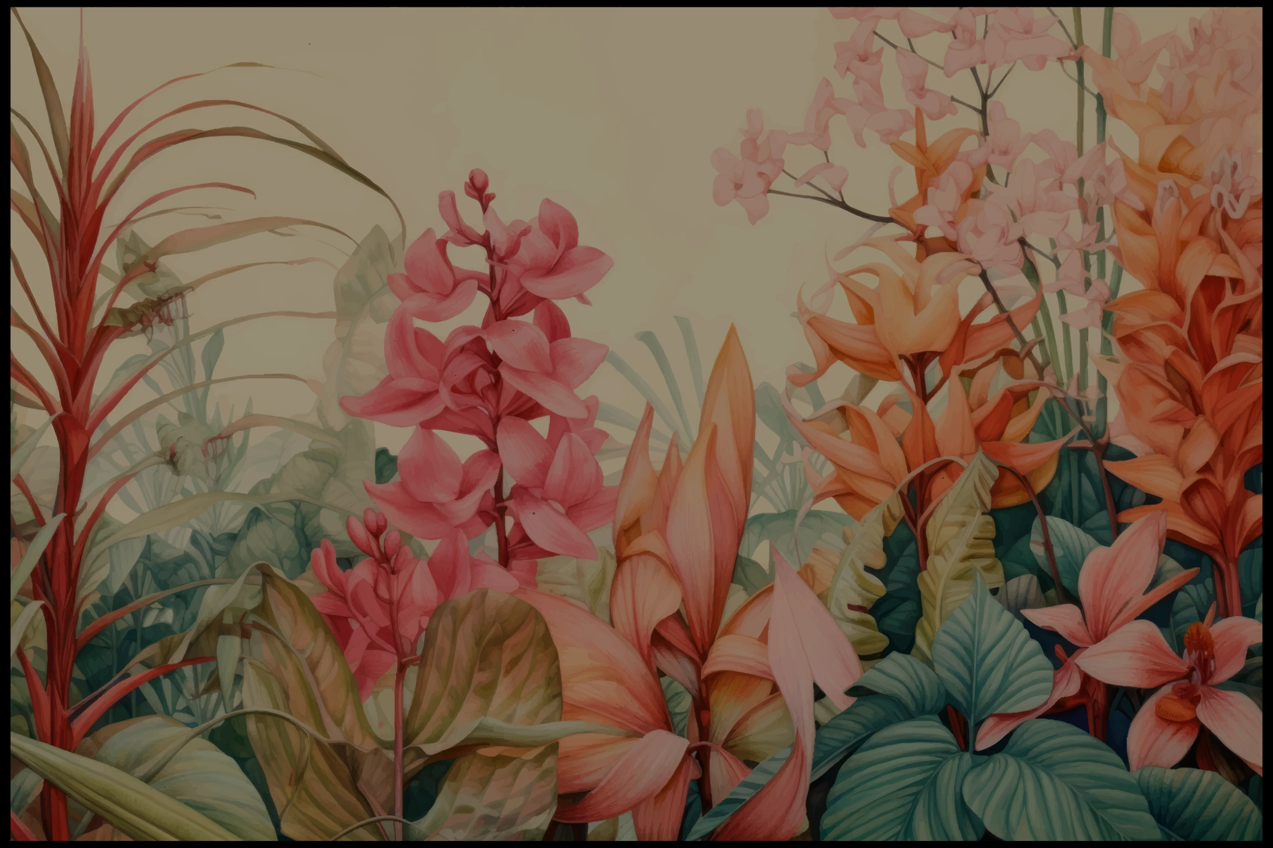 Ce papier peint tropical dévoile un univers botanique d’exception, où se mêlent harmonieusement fleurs exotiques aux pétales généreux et feuillages luxuriants aux formes sculpturales. Les orchidées roses s’épanouissent avec grâce tandis que les lys orangés apportent une note chaleureuse à cette composition végétale. Le style aquarelle confère à l’ensemble une texture picturale raffinée, où chaque trait semble caresser le regard. Les tons pastel – rose poudré, pêche délicat, vert sage et beige nacré – se fondent dans un dégradé naturel qui évoque les premières lueurs de l’aube dans une jungle tropicale.