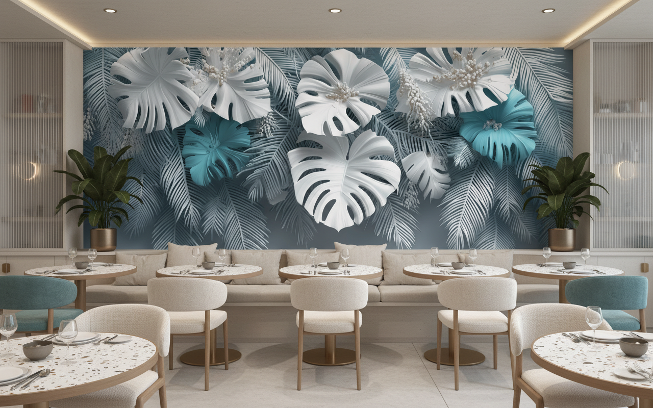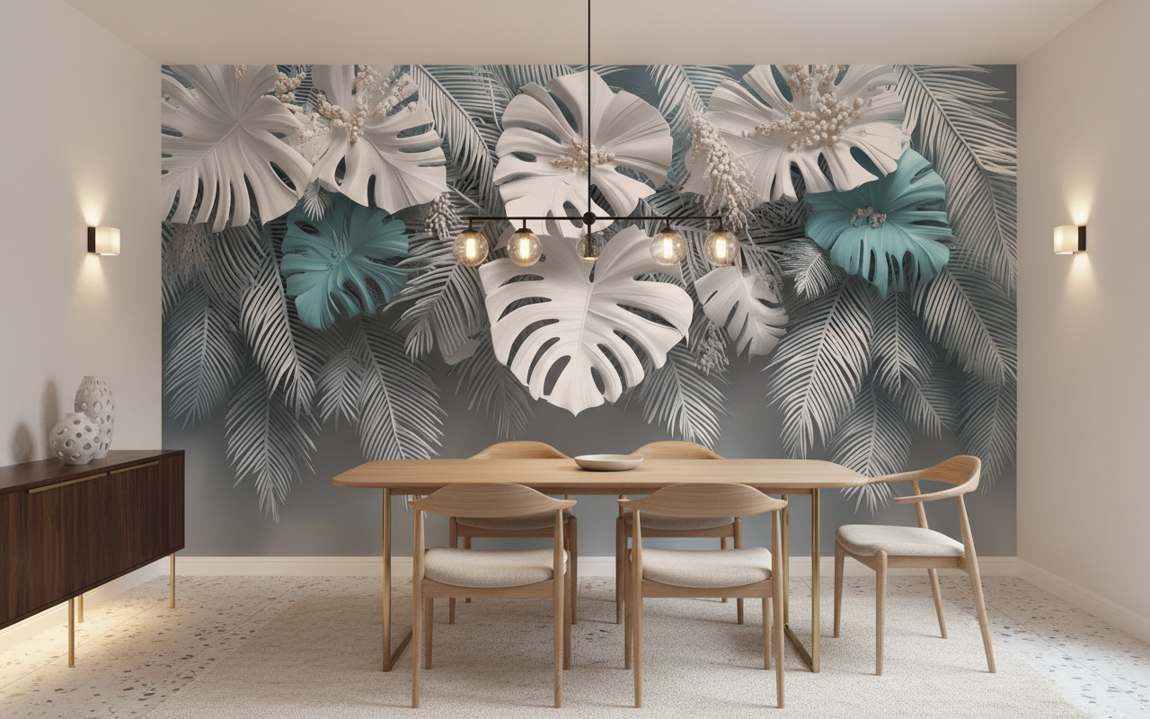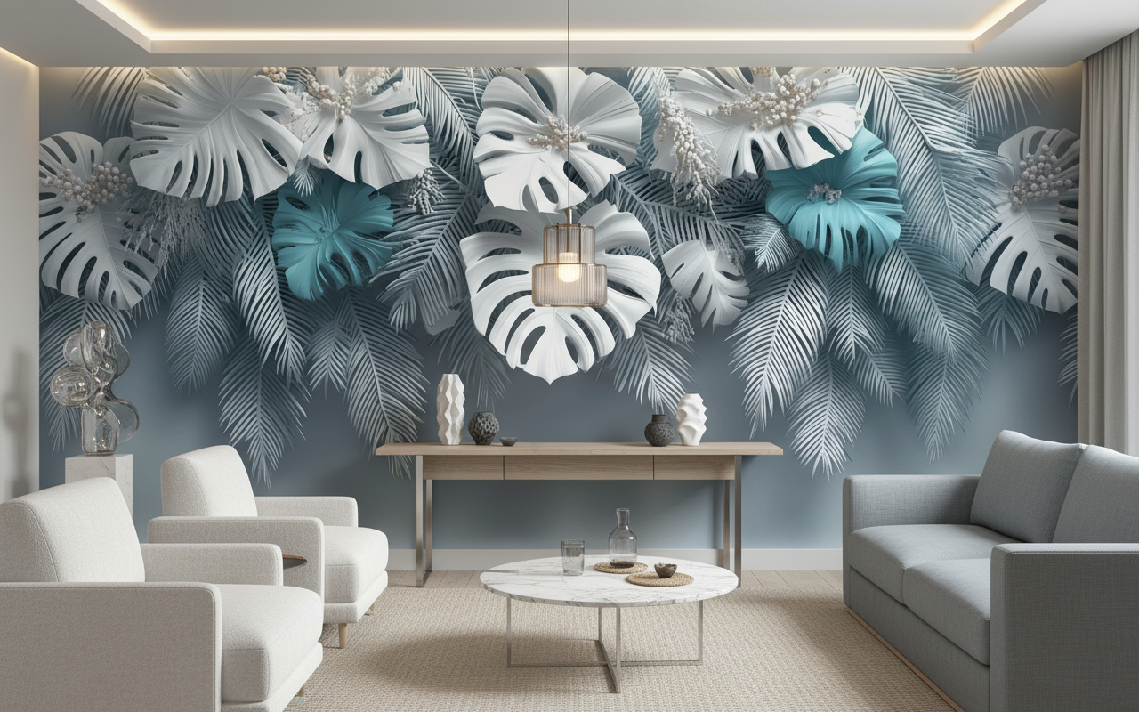 Laissez-vous porter par la brume mystérieuse d’un jardin tropical imaginaire, où les feuillages exotiques dansent dans une symphonie de bleus apaisants et de blancs immaculés, créant une oasis de sérénité au cœur de votre intérieur. Ce papier peint tropical dévoile un univers botanique d’une rare élégance, orchestrant un ballet végétal entre feuilles de monstera aux découpes graphiques majestueuses et délicates palmes exotiques qui s’épanouissent dans un camaïeu sophistiqué. Les motifs végétaux se déploient avec une précision artistique remarquable, alternant entre des feuillages blancs nacrés et des tons turquoise profonds, rehaussés de subtiles touches de gris perle. L’effet de profondeur est magistralement rendu grâce à un jeu d’ombres et de lumières qui confère à chaque feuille tropicale un relief saisissant, comme suspendue dans une brume délicate aux reflets bleutés. L’atmosphère qui émane de ce papier peint jungle chic invite à la contemplation et à l’évasion. Cette décoration murale tropicale transforme instantanément votre espace en un sanctuaire de bien-être, où règne une ambiance zen teintée d’exotisme raffiné. La palette chromatique, dominée par des bleus apaisants et des blancs lumineux, insuffle une sensation de fraîcheur perpétuelle, évoquant la rosée matinale sur les feuillages luxuriants d’une forêt tropicale préservée. Ce revêtement mural végétal trouve sa place idéale dans un salon contemporain, où il créera un magnifique mur d’accent derrière un canapé en lin naturel ou des fauteuils en rotin tressé. Dans une chambre parentale, il apportera une touche de sérénité tropicale particulièrement propice à la détente, sublimé par du mobilier en bois clair et des textiles aux tons poudrés. Pour un bureau à domicile, cette fresque botanique stimulera la créativité tout en préservant une atmosphère apaisante. Associez-le à des matières nobles comme le laiton brossé, le marbre blanc ou des fibres naturelles pour créer un ensemble décoratif d’une harmonie parfaite. L’esthétique de ce papier peint nature chic s’inscrit dans la tendance du style tropical moderne, où l’exubérance végétale rencontre la sophistication contemporaine. Cette tapisserie exotique transcende les codes décoratifs traditionnels pour offrir une interprétation poétique et raffinée de l’art botanique. Transformez votre demeure en un écrin de verdure stylisé, où chaque regard porté sur ce papier peint feuillage vous transportera vers des horizons lointains, dans un murmure perpétuel de feuilles caressées par la brise tropicale.