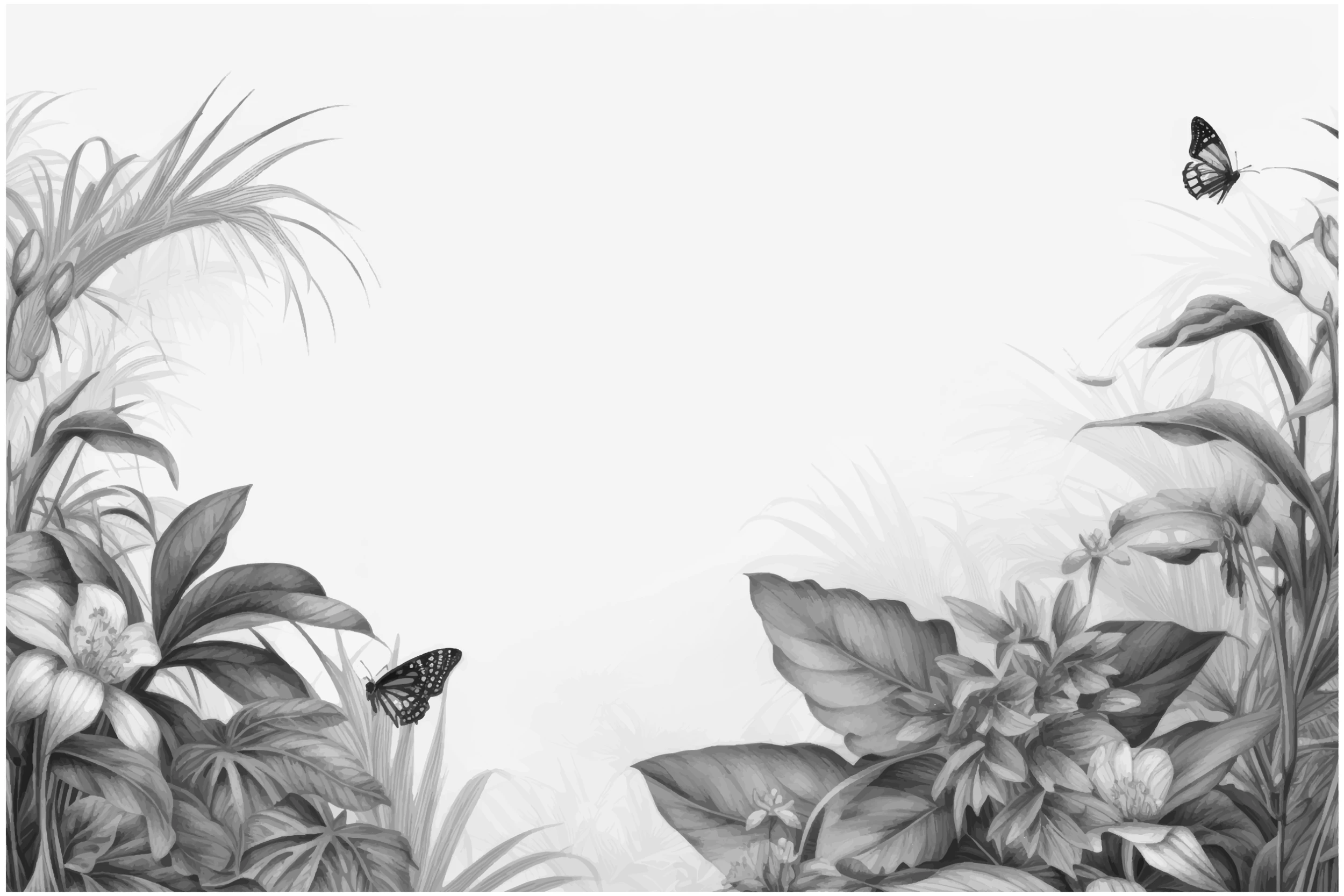 Jardin secret monochrome d’une élégance intemporelle. Papier peint tropical noir et blanc avec papillons et végétation luxuriante. Créez une ambiance chic et apaisante, sur mesure.