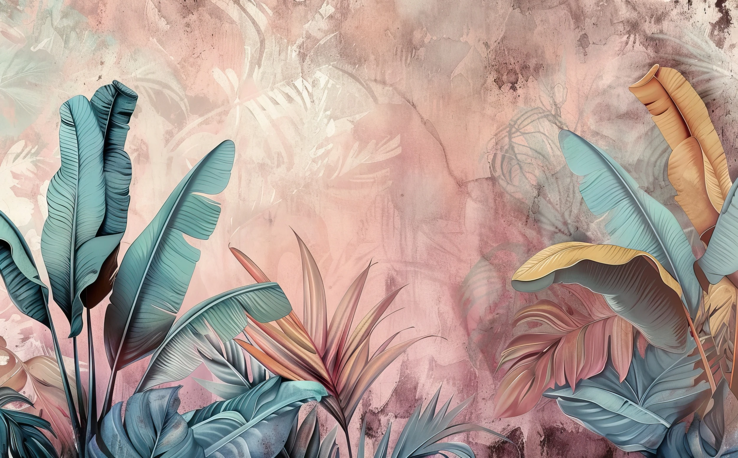 Cette création murale dévoile une composition florale exotique d’une rare élégance, où se déploient majestueusement les feuilles de bananier et les palmes tropicales. Le style graphique, d’inspiration aquarelle moderne, révèle des détails finement ciselés sur chaque nervure végétale. Les feuillages XXL se parent de teintes bleu-vert océan et cuivre doré, sublimées par un arrière-plan aux tons rose poudré et beige rosé.