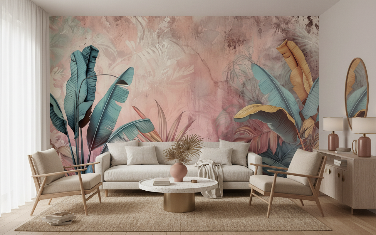 Ce papier peint tropical pastel trouve sa place d’honneur dans une chambre parentale en tant que tête de lit artistique, créant un refuge intimiste et élégant. Il sublime également un salon contemporain en tant que mur d’accent, s’associant harmonieusement avec du mobilier en bois naturel, des textiles en lin écru et des accessoires en laiton brossé.