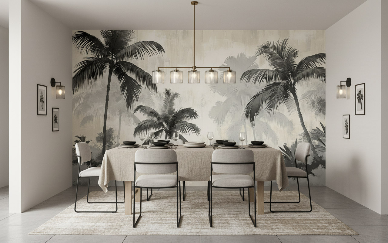 Ce revêtement mural tropical trouve sa place idéale dans un salon contemporain en tant que mur d’accent spectaculaire, une chambre parentale pour créer une atmosphère de sérénité exotique, ou encore un bureau pour stimuler la créativité. Associez-le harmonieusement à du mobilier en bois naturel, des textiles en lin écru ou coton blanc, et des accessoires en rotin tressé. Les matières brutes comme le jute, la pierre naturelle ou le laiton brossé sublimeront cette esthétique tropicale moderne. Pour les couleurs d’accompagnement, privilégiez des tons neutres : beiges sablés, blancs cassés, ou touches de vert sauge pour rappeler la végétation.