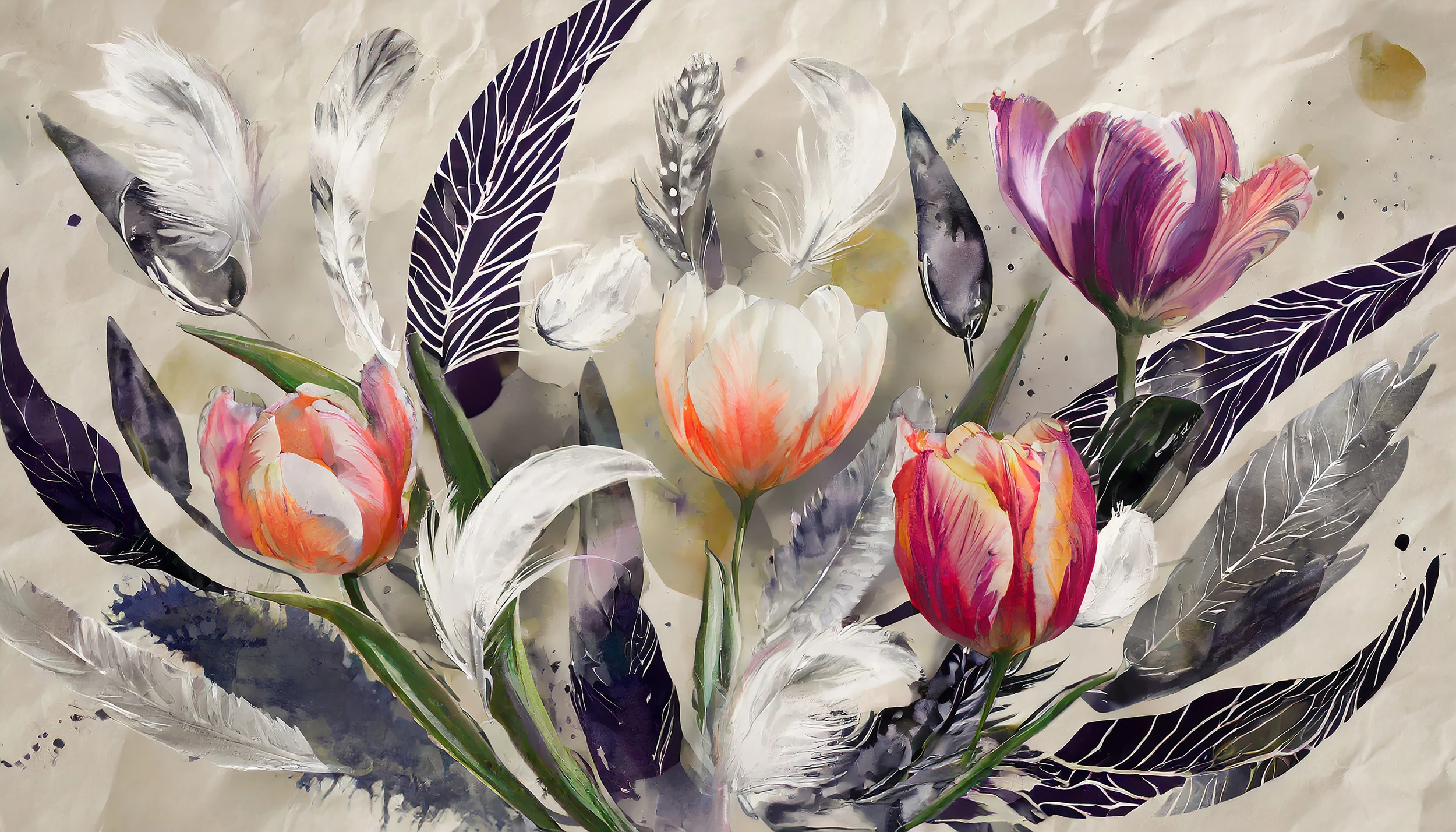 Laissez-vous porter par la délicatesse d’un jardin suspendu où les plumes dansent avec les tulipes dans une symphonie de couleurs pastel et de nuances profondes.