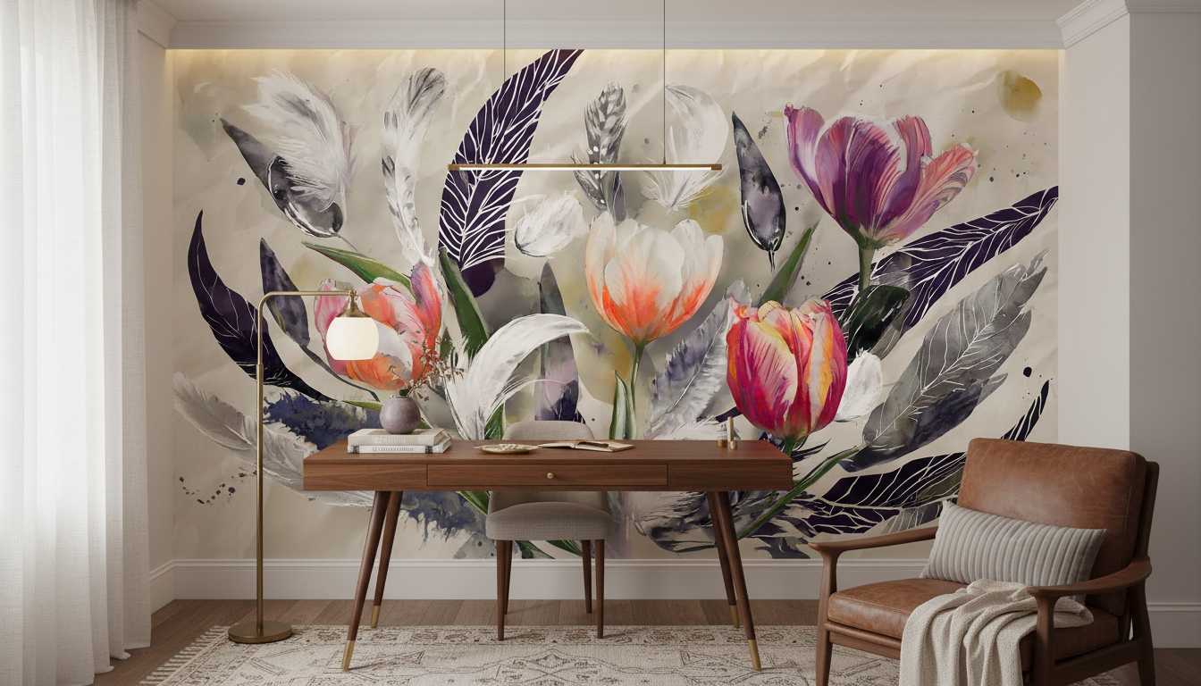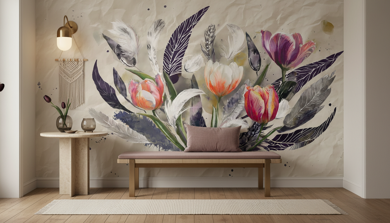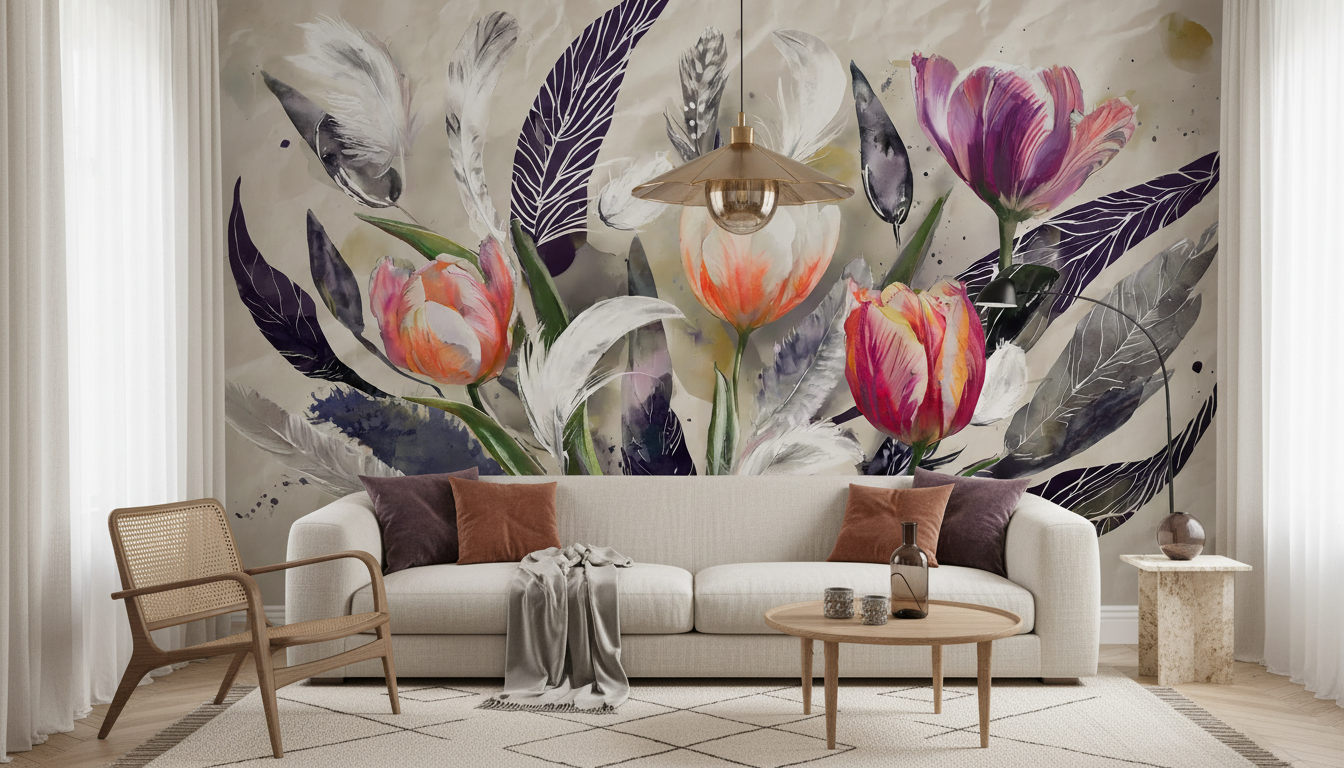 Papier Peint Tulipes Aquarelle et Plumes Bohème Chic