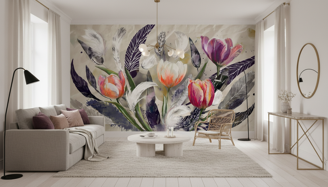 Sublimez votre intérieur avec ce papier peint sur mesure Tulipes & Plumes. Un design aquarelle bohème chic pour une ambiance romantique et raffinée. Transformez votre espace en une œuvre d’art murale unique et apaisante.