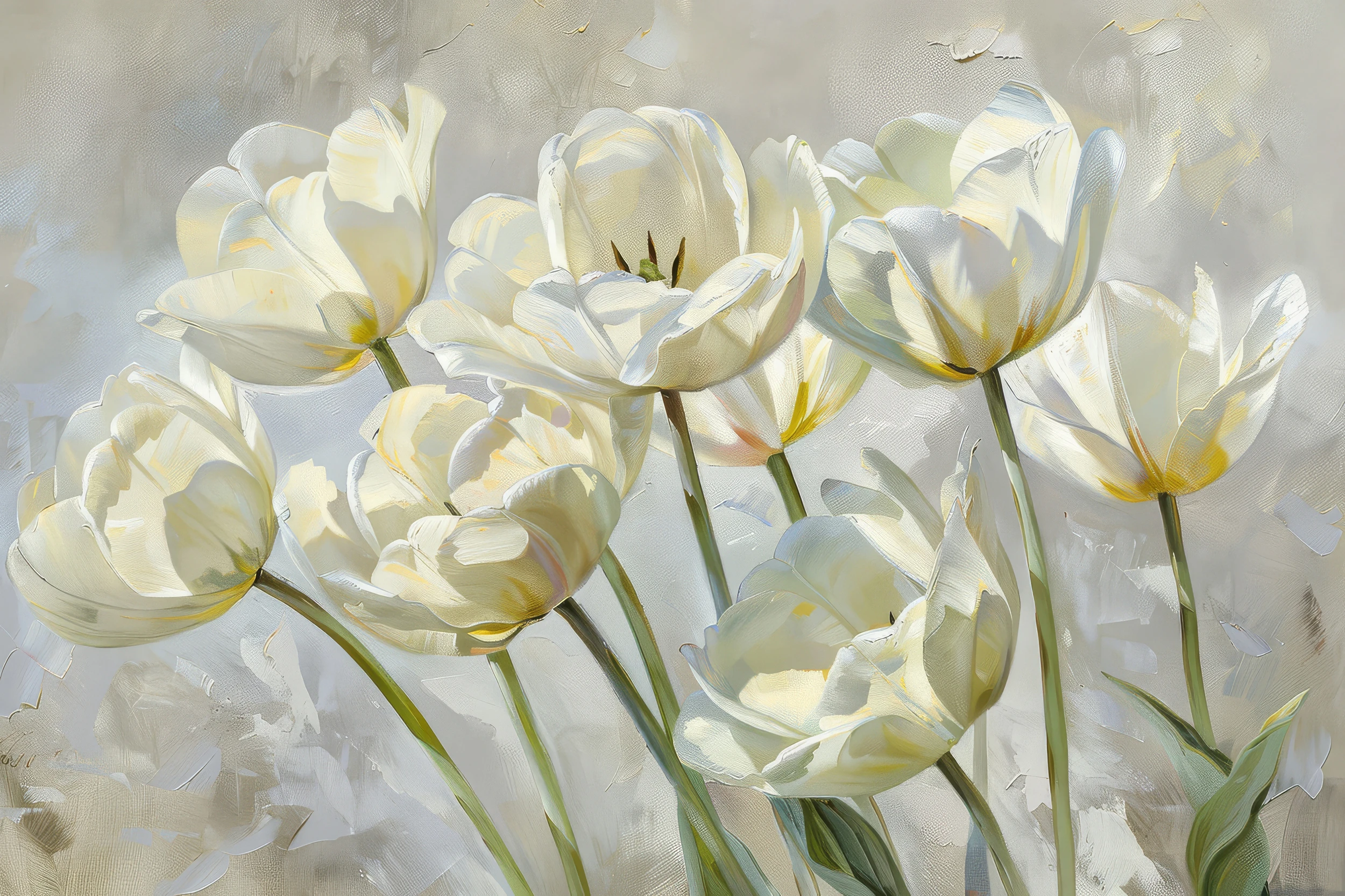 Ce papier peint floral révèle une composition artistique exceptionnelle où se mêlent harmonieusement plusieurs tulipes blanches aux pétales soyeux, magnifiées par des tiges vertes élancées. La technique picturale évoque l’art de l’aquarelle contemporaine, avec des touches de pinceau visibles qui confèrent une authenticité saisissante à l’ensemble. Les nuances blanc nacré dominent la palette chromatique, sublimées par de subtiles pointes de jaune doré au cœur des corolles et rehaussées par le vert tendre des tiges. L’arrière-plan se pare de tons beiges et gris perle, créant un effet de profondeur et de mouvement qui donne vie à cette fresque murale végétale.