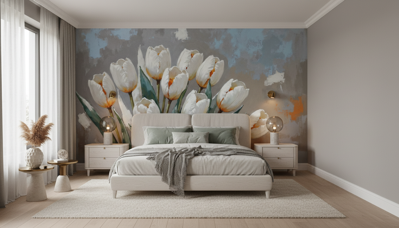Ce papier peint fleurs blanches trouve naturellement sa place dans une chambre parentale, où il créera une atmosphère apaisante propice au repos. Il sublimera également un salon contemporain en tant que mur d’accent, apportant une touche de nature raffinée sans surcharger l’espace. Pour une salle à manger, il offrira un écrin délicat aux repas familiaux. Associez-le à du mobilier en bois clair, des textiles en lin naturel ou en coton blanc cassé pour prolonger cette atmosphère de pureté. Les accessoires en cuivre ou en laiton brossé feront magnifiquement écho aux nuances orangées des tulipes, tandis que des coussins vert sauge rappelleront subtilement le feuillage.