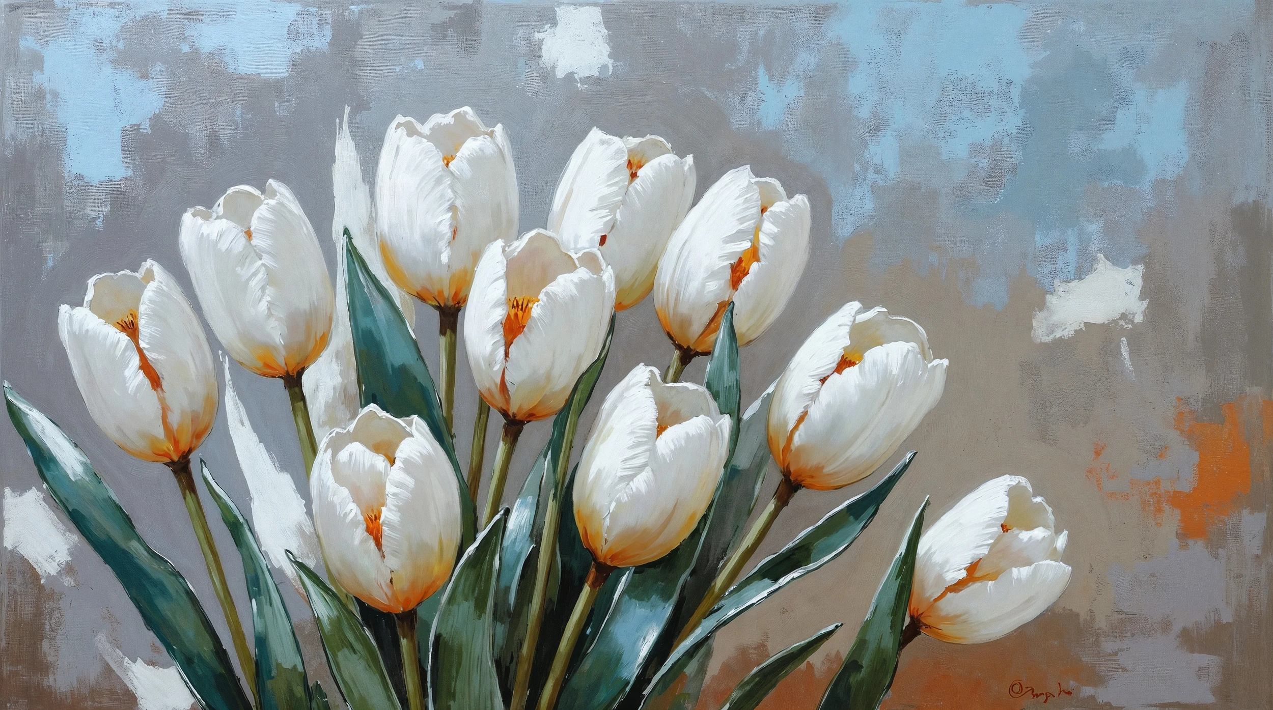 Cette œuvre murale dévoile un bouquet de tulipes blanches aux pétales délicatement ourlés d’orange cuivré, peintes dans un style pictural d’une remarquable finesse. L’artiste a su capturer l’essence même de ces fleurs printanières avec un réalisme saisissant, où chaque corolle semble vibrer de vie. Les feuilles vert émeraude s’élancent gracieusement, créant un équilibre parfait entre verticalité et douceur. Le fond nuageux aux nuances de gris perle et d’azur délicat évoque un ciel d’orage apaisé, rehaussé de subtiles touches d’orange cuivré qui font écho aux cœurs des tulipes.
