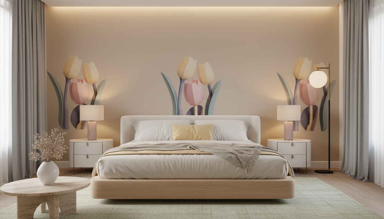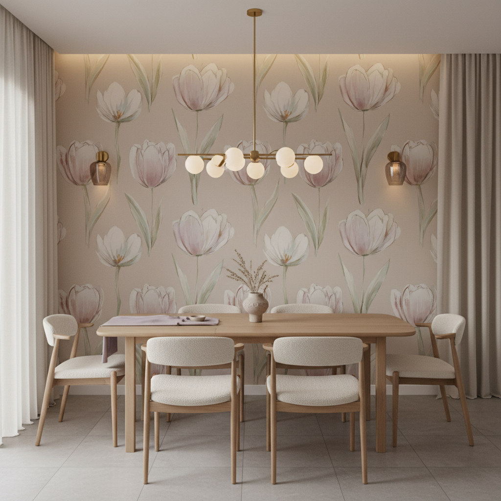 Pour une harmonie décorative parfaite, mariez cette fresque murale florale avec des teintes neutres comme le blanc cassé, le beige rosé ou le gris perle. Des touches de cuivre ou de rose gold viendront rehausser la sophistication de l’ensemble, tandis qu’un mobilier aux lignes épurées mettra en valeur la beauté graphique des tulipes.