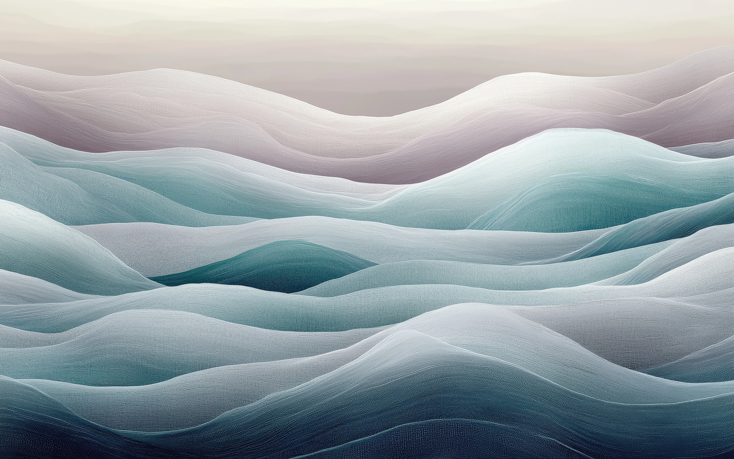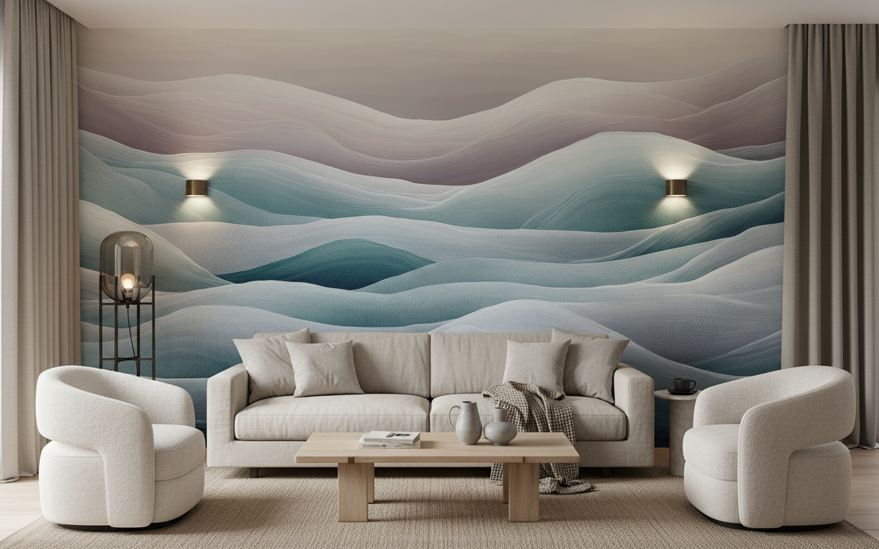 Ce papier peint contemporain révèle un paysage abstrait fascinant, composé de courbes fluides qui se superposent et s’entremêlent avec une grâce naturelle. Les motifs ondulants évoquent tantôt des vagues déferlantes, tantôt des collines brumeuses ou des drapés soyeux flottant dans l’air. Le style graphique privilégie la pureté des lignes courbes et joue subtilement sur les effets de transparence et de profondeur. La palette chromatique se décline dans des tons poudrés délicats : bleus céladons, gris perle, violets tendres et blancs nacrés se fondent harmonieusement, créant un dégradé subtil qui apporte profondeur et mouvement à l’ensemble.